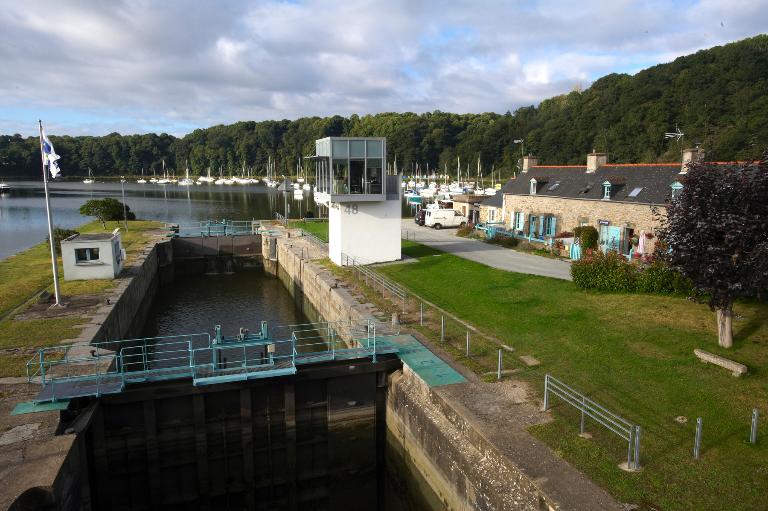 Les maisons éclusières furent construites en même temps que la première écluse. Le pont pivotant, lui, ne fut construit qu'en 1892, plusieurs années après la première demande de la mise en place d'un moyen pour traverser le canal. Le pont qui enjambe actuellement la Rance date des années 1950, il remplace un ancien pont pivotant. Dans les années 1960, on rajouta un système de pont à bascule sur une partie de la nouvelle construction, permettant le passage des bateaux à voile, de plus en plus fréquents.