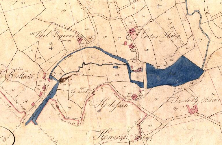 Il s'agit d'un bassin de grande taille constitué de moellons de schiste. Trois murs sur quatre sont encore en bon état. Des galets de granite servant au lestage des gerbes de lin y ont été retrouvés.
