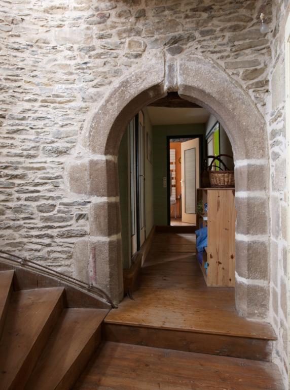 Maison à plan double en profondeur, deux étages carrés et élévation ordonnancée. La mise en oeuvre des murs est en moellon de schiste avec encadrement de baies et chaînage d'angle en pierre de taille de granite. Des bandes d'enduit à la chaux simulent bandeaux et corniche sur la façade. Placé contre la façade arrière, dans l'angle nord-ouest, l'escalier en vis hors-oeuvre dessert les étages. Le jardin en terrasses est enclos de murs, fermé au nord par un alignement de dépendances. Construit dans le prolongement du logis, le corps d'entrée à porte charretière permet le passage des voitures.
