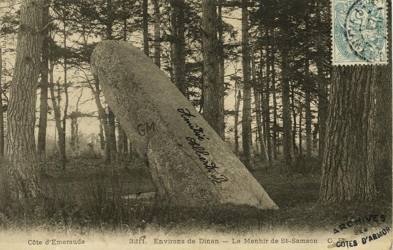 Ce mégalithe édifié à la période du Néolithique témoigne d'une présence humaine sur ce site dès l'an 3000 avant JC. Dans cette grosse masse de granite apparait, à mi-hauteur, un filament de quartz. Une légende raconte que c'est le diable en personne qui par dépit aurait lancé son fouet sur sa surface après avoir cherché à tenter, sans succès Saint-Samson. Outre, les nombreuses légendes qui y sont associées, son originalité provient d'une série de gravures se rapprochant pour certains thèmes des "idoles carrées" de l'allée couverte de Prajou-Menhir à Trébeurden. Il est classé au titre des Monuments Historiques depuis le 2 mars 1977.