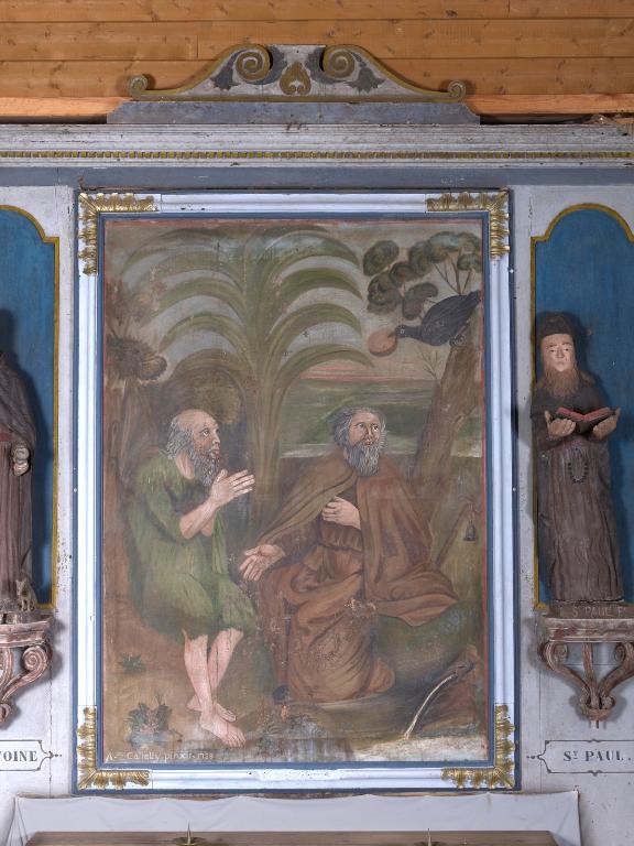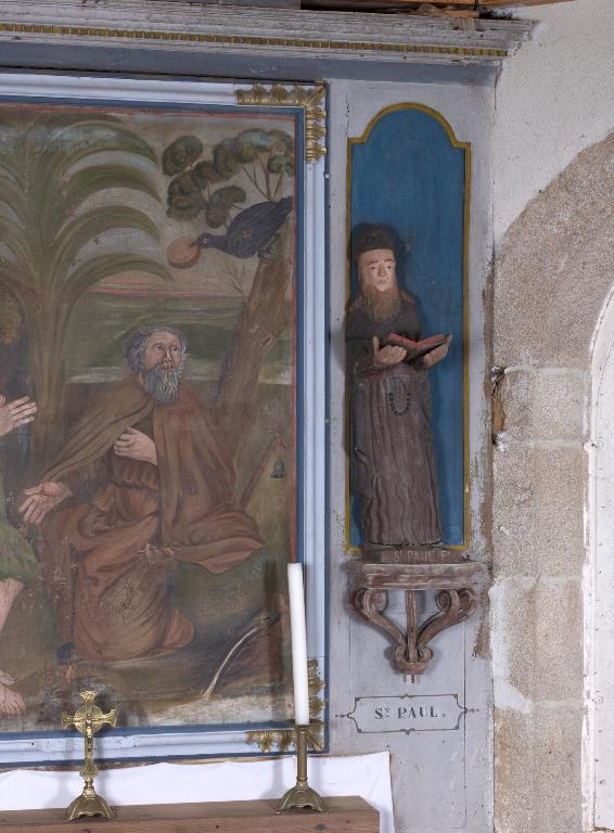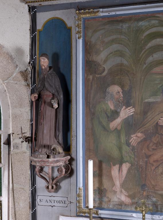 La chapelle Saint-Antoine est édifiée au 17e siècle, à l'ouest du bourg, comme en témoigne la porte ouest en plein cintre chanfreinée et le clocheton à l'aplomb du pignon. Dans la seconde moitié du 18e siècle, la chapelle est agrandie vers l'est avec la construction d'un nouveau choeur à trois pans. Créé pour ce nouveau chevet, le retable en bois polychrome constitue le décor du sanctuaire, éclairé par les deux baies latérales du choeur. Sa composition est très simple, à la mesure de l'édifice : deux niches à statues encadrent un tableau naïf couronné d'un entablement réduit à sa plus simple expression. En écho au sujet du tableau daté 1788, la rencontre de saint Antoine et saint Paul, les statues du 17e siècle des deux saints ont trouvé leur place dans ce décor. Au début du 19e siècle, de nouvelles baies sont percées sur les façades nord et sud. Elles sont contemporaines de la croix érigée en 1816 par Jean Le Fichant, trésorier (gouverneur) de la chapelle Saint-Antoine comme en témoigne l'inscription sculptée sur le socle : "FAIT FAIRE PAR IEAN LE FICHANT MAGDELAINE MINGUY SON EPOUSE GOUVERNEUR DE ST ANTHOINE EN POMMERIT LAN 1816". Le couple Le Fichant fait partie des notables de la commune, il exploite les terres de Kersaliou dont il est locataire.
