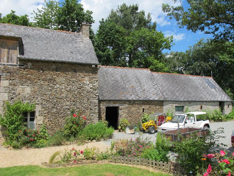 Façade traditionnelle en moellons avec encadrements des ouvertures en pierre de taille de granite pour la pièce habitable. Des linteaux de bois sont utilisés pour le cellier et les greniers. Le regroupement des percements au centre de la façade correspond à des usages utilitaires.