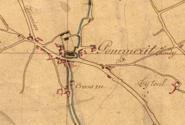 Le bourg est établi sur un tronçon de l'antique voie gallo-romaine allant de Guingamp à Plougrescant. Il se situe sur un des points culminants de la commune, au carrefour de voies (actuelles D6 et D8) menant à La Roche-Derrien, Runan, Ploëzal et Pont Rod où le gué établi sur l'estuaire du Jaudy permettait de rejoindre Tréguier. Le toponyme Pommerit dérive du latin Pommerat-um, le village entouré de vergers (de poma, fruit). Il témoigne d'une première agglomération gallo-romaine construite sur le site du bourg actuel, le long de la voie. Le nom de lieu Croaz Ru (Croix rouge, par extension croisement rouge) écrit sur le cadastre ancien, au sud de l'église paroissiale (actuelle jonction entre la rue des écoles et la rue de la gare et de l'Argoat), atteste également d'une occupation antique des lieux : un croisement (croaz) établi à l'emplacement d'un bâtiment gallo-romain en brique et tuile rouge (ru).
