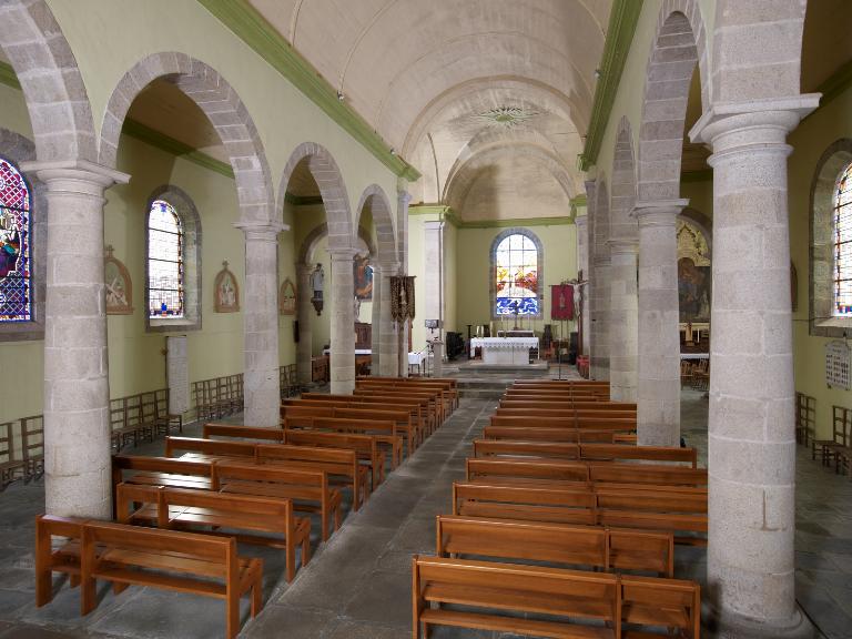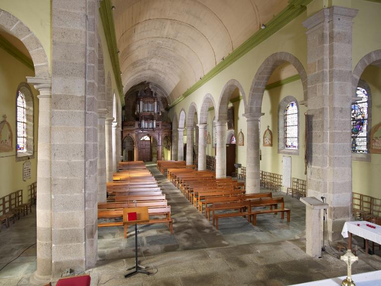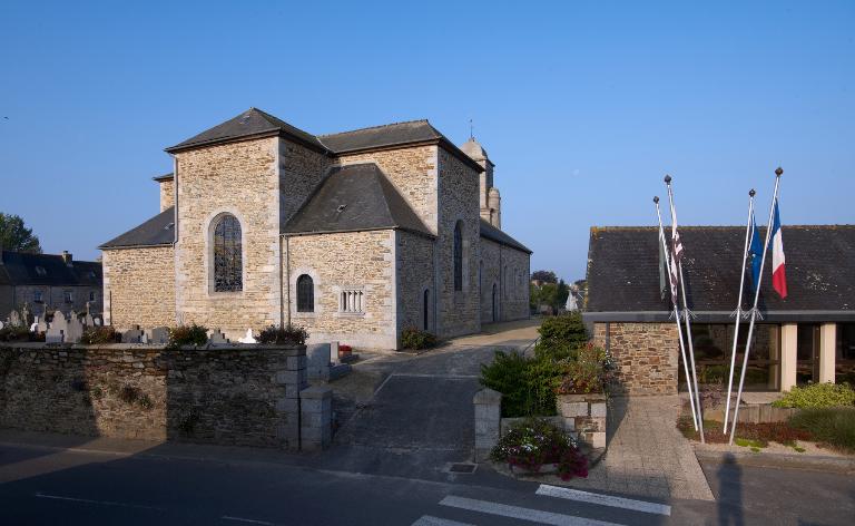 L'église en moellon de schiste présente un plan en croix latine dont la nef est séparée des bas-côtés par six travées en plein cintre auxquelles s'ajoute la travée du clocher. L'ensemble est couvert d'un lambris en bois. Le chevet plat, éclairé par une verrière, est accostée de deux sacristies dont l'une possède un ossuaire intégré, aéré par une baie à colonnettes. Celui-ci abritait des boîtes à crânes que l'on trouve encore dans certains ossuaires. Le clocher, en pierre de taille de granite, couvert d'un toit à dôme également en pierre, est desservi par une tourelle d'escalier latérale.