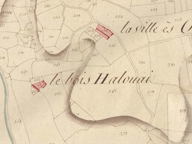 -Une pièce de terre labourable apellée le Domaine de la Ville es Olliviers, contenant six journeaux, joignant d'orient au chemin de Lanvalay aux Rochettes, du midy et occident au chemin des Rochettes a la Ville es Olliviers et du nord a la petite vallée du Tertre cy dessus, sur les fossés de cloture de la quelle il existe quatre vingt deux pieds d'arbres émondables. Estimé valloir de rente et de revenu annuel, soixante douzes livres cy 72l.
