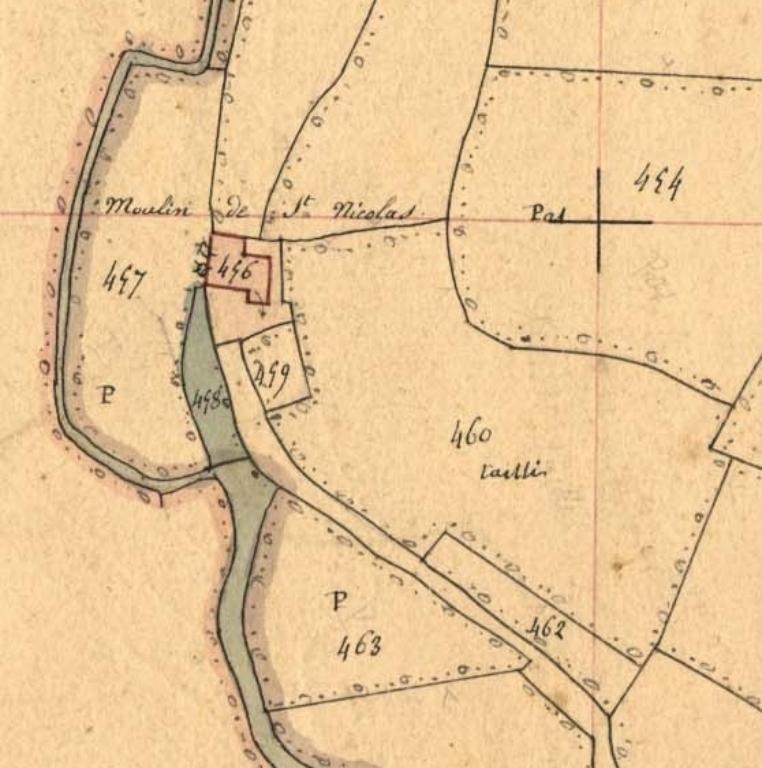 A signaler, que le père de Louis Le Joncour nommé Mathieu était le meunier - en fermage - du moulin de Saint-Nicolas ancien. Les terres, décrites comme "rosières, pré et rabinière de Saint-Nicolas" et les ruines d'une maison appartenaient en 1794 au citoyen Corentin Désiré Le Dall, officier du régiment Dauphiné, mais émigré. Selon les estimations issues du procès verbal des Biens nationaux, le pré de Saint-Nicolas permettait de produire 14 charrettes de foin par an. Dans ce périmètre est également évoqué la présence d'une "fontaine construite en pierre de taille". Enfin, Il est décrit comme "avantage" les coupes des émondes des rabines (allées) et des arbres.