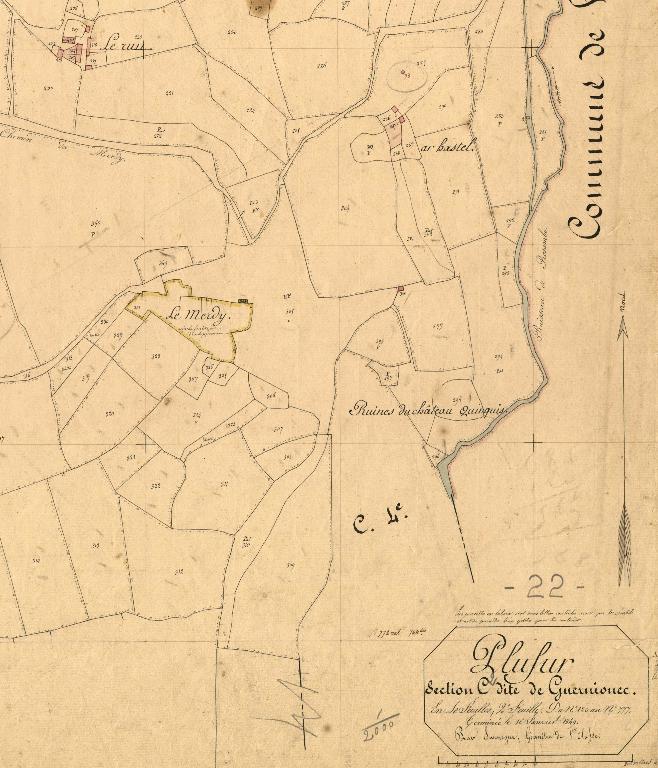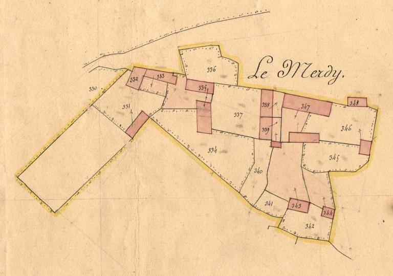 Ensemble bâti ancien, à la fois résidence et exploitation agricole, figurant sur le cadastre de 1816 de Plestin associé au toponyme "Le Merdy". Le cadastre de 1848 de Plufur permet de dénombrer 14 bâtiments et 7 cours. Il s'agit d'un alignement de deux logis d'époques différentes (voir géoréférencement). Si la très grande majorité des logis de ferme est orientée vers le sud, certains logis dérogent à la règle avec une élévation principale orientée vers l'ouest ou vers l'est. Cet alignement - orienté vers l'est - se compose de la manière suivante :