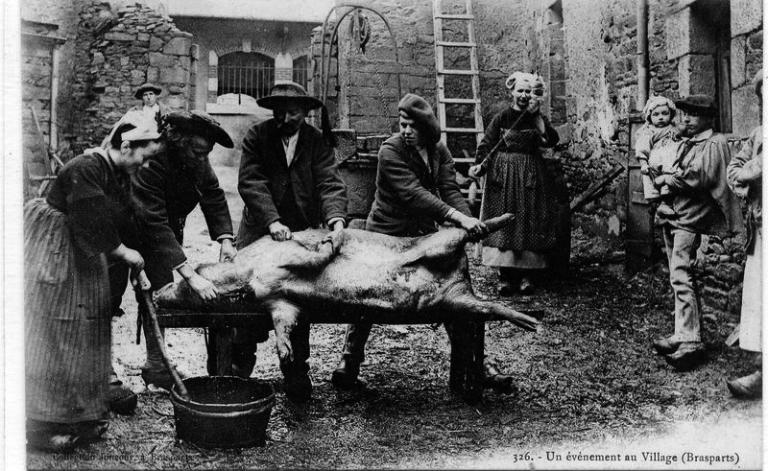 L’élevage d'un cochon (porc) était fréquent dans les fermes bretonnes. Pratiqué pour les besoins de la consommation familiale, son élevage était cependant loin d'être systématique dans des contrées où la famine sévit régulièrement. Le cochon et l'homme peuvent en effet se disputer la même nourriture. Dans l'évêché de Quimper (à l'exception notable de la subdélégation de Corlay), on ne compte qu'un porc pour deux familles au milieu du 18e siècle. L’élevage des cochons semble être l'expression de la classe moyenne aisée : paysans propriétaires, laboureurs, meuniers, boulangers et fourniers. Le lard (kig) était la seule viande couramment consommée dans les campagne : il permettait de donner de goût à la soupe quotidienne et à la potée dominicale.