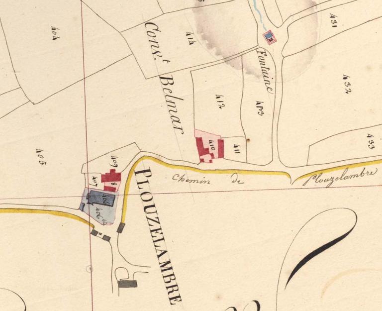 Selon l'histoire locale, la fontaine Saint-Sylvestre et l'oratoire de Plouzélambre auraient été édifiés à la suite d'une rivalité entre deux familles seigneuriales, l'une habitant le manoir de Kervégan à l'ouest, l'autre celui de Kerbavé à l'est. Cette fontaine, élevée par les seigneurs de Kerbavé, est vraisemblablement datable de la seconde moitié du 16e siècle.