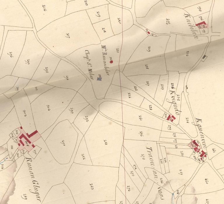 Cette chapelle est dédiée à saint Mélar (connu également comme saint Méloir). A 112 mètres au-dessus du niveau de la mer, elle domine la vallée du Roscoat à Plouzélambre.