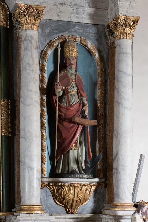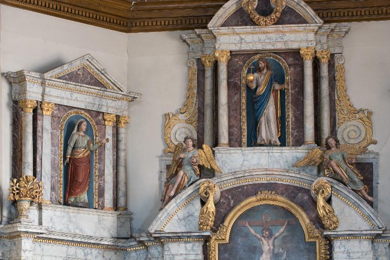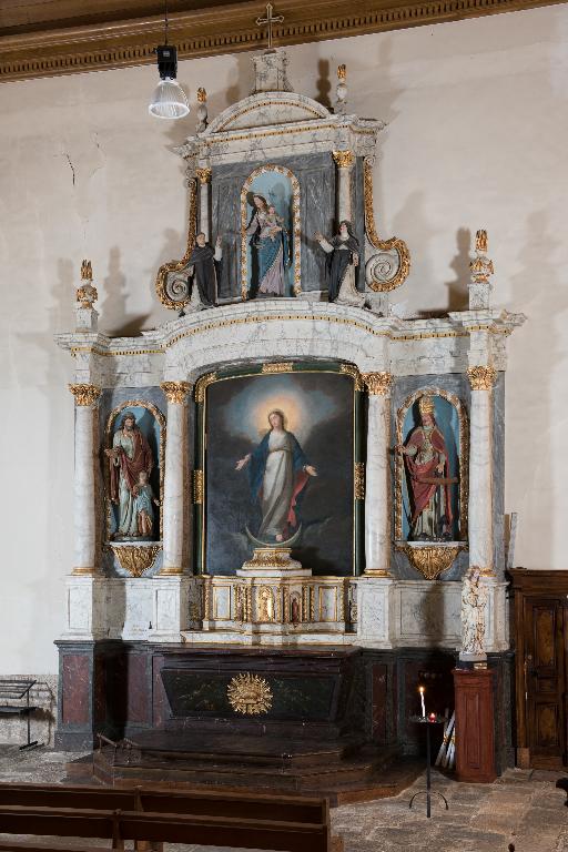 Le nouvel édifice contient des retables, influences tardives du modèle lavallois, disposés dans le chœur et les deux chapelles latérales. Le retable du maître-autel occupe les trois pans du chevet, et des statues de saint Pierre et de saint Paul, patrons de la paroisse, sont disposées de part et d'autre de l'autel.
