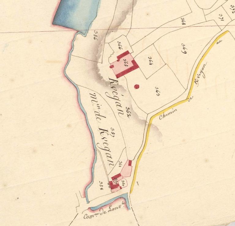 Les dispositions anciennes du manoir de Kervégan sont connues par les cadastres de 1814 et de 1848 : une avenue cavalière orientée vers l'est-nord-est, un colombier situé originellement au sud du manoir (disparu), un four à pain situé à l'ouest de la cour (disparu), un vaste logis et un moulin à eau sur le Ruisseau de Roscoat. Les bâtiments anciens et la cour sont par ailleurs connus par un dessin de Henri Frotier de La Messelière de 1935. La cour de ce manoir était fermée vers l'est-nord-est par une porte charretière et une porte piétonne contre lesquelles des soues à cochons ont été aménagées au 19e siècle. Cette entrée monumentale a été déplacé à Lanloup après 1974. Le puits a également été vendu.