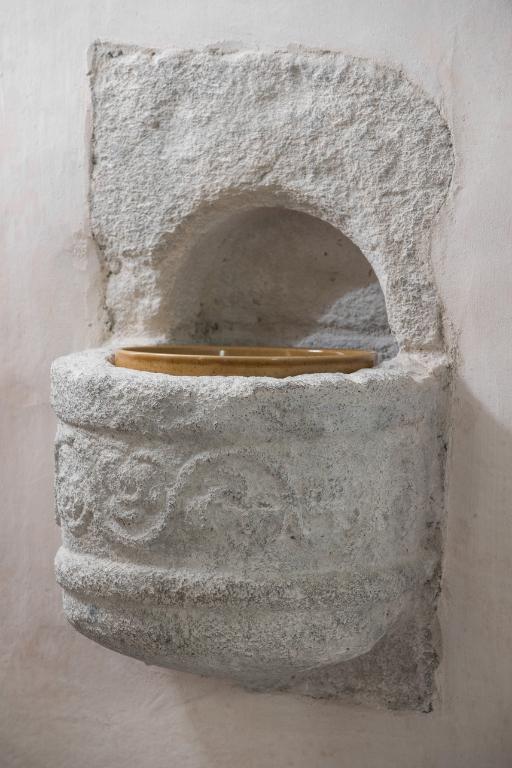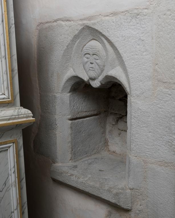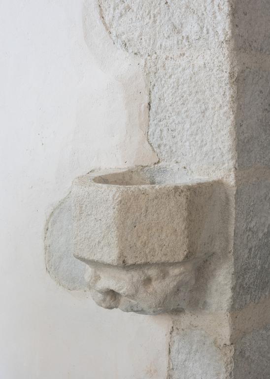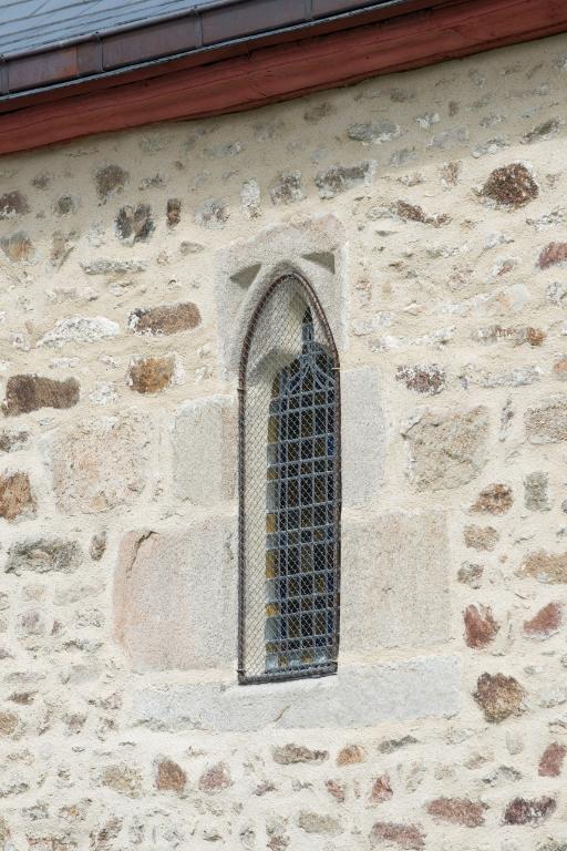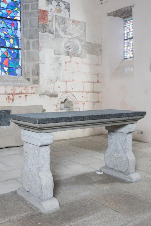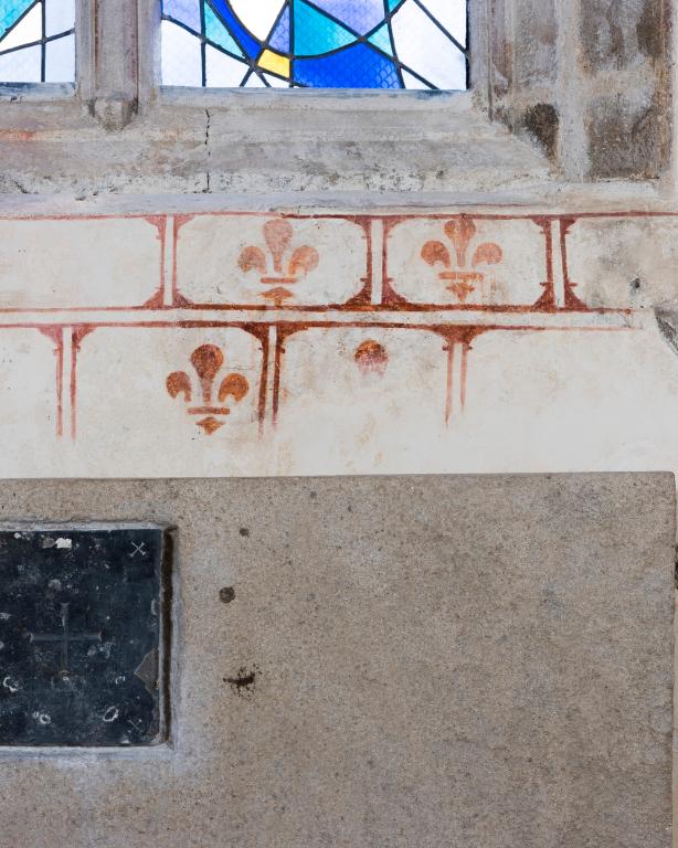 Du 14e siècle subsiste, à gauche de la baie un personnage dont on aperçoit la tête et la main. Il semble reprendre le même geste que le Christ situé au-dessus. Ce petit personnage bouclé et souriant se réfère à l’ange souriant de Chartres du 13e siècle mais également à l’art de l’enluminure du 14e siècle à la cour de France. Le même faux appareillage peint se retrouve également dans le réfectoire de l’abbaye de Léhon. Celui à la moucheture d’hermines est plus ancien que celui décoré de fleurs de lys de la fin du 15e siècle. Deux litres seigneuriales, sur fond noir, sont peintes à des époques différentes. Les armoiries de la litre plus petite ne sont pas identifiables. Celles de la litre plus grande présentent à gauche, les armes des Ferré, d’argent à une face d’azur et trois molettes surmonté d’un heaume avec cimier et panache représentant un aigle aux ailes déployées, et à droite de la baie : le blason des Quédillac, de gueules à trois fasces d’argent surmonté d’un cimier et d’un panache à tête de chèvre. Le contrat de mariage entre Catherine de Quédillac et Bertand Férré attesté en 1512 permet de dater de la première moitié du 16e siècle ce décor peint. Enfin des vestiges d’un décor d’accompagnement du retable a été réalisé à la fin du 19e siècle par D. Lavenant, peintre à Saint-Brieuc.