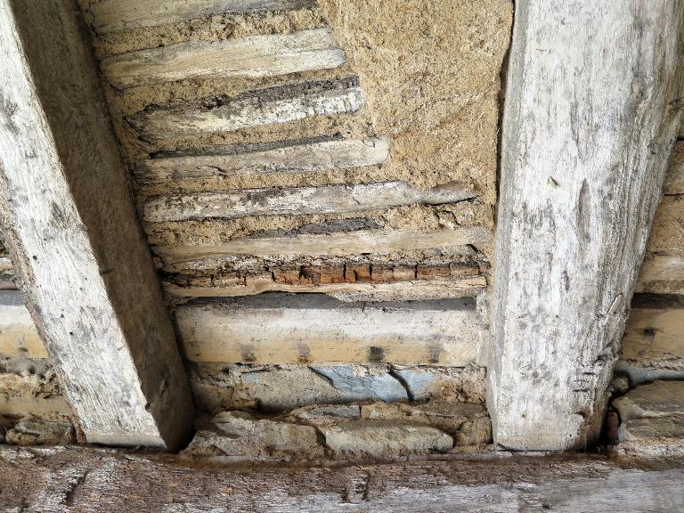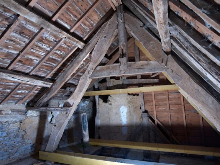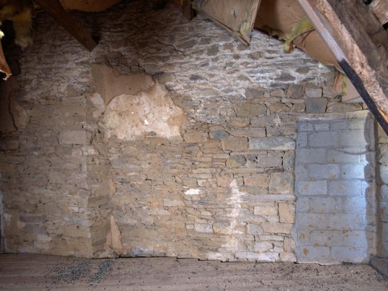 Pour entrer au grenier bout au levant une porte carrée de taille ; ledit grenier éclairé par deux lucarnes ; au pignon au levant un petit chauffe-pieds ; au nord dudit grenier autre petit grenier y attenant et se communiquant ; lattre desdits en terrasse ; le comble et charpente de l’édifice cy devant descrit chevronné de sciage sous une mauvaise couverture d’ardoise.
