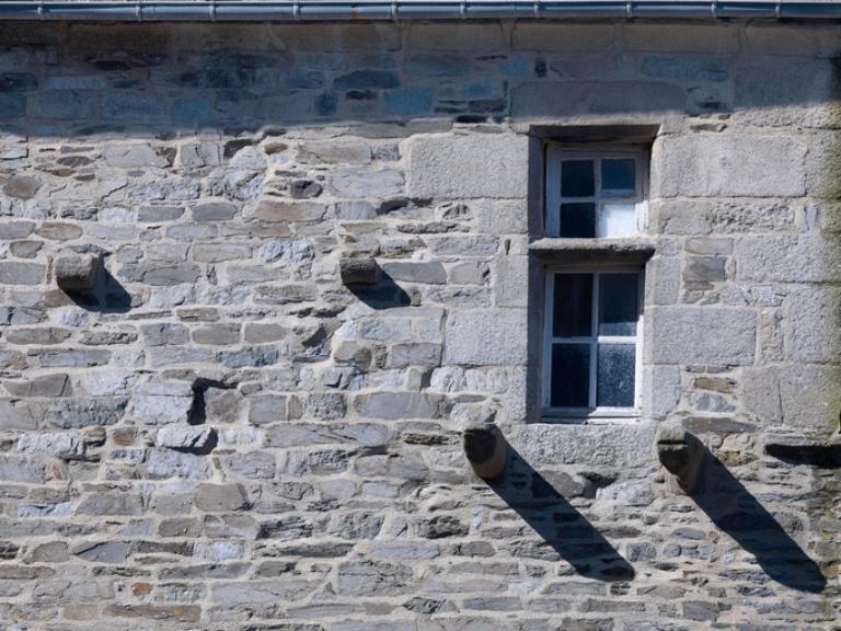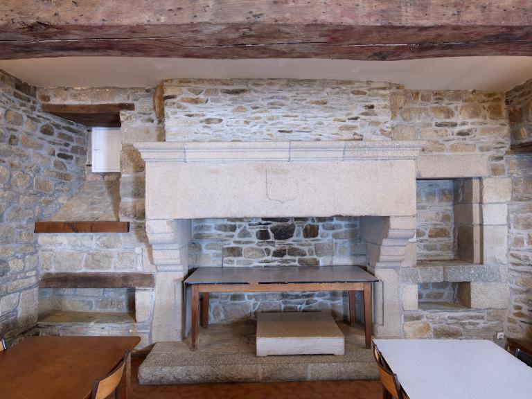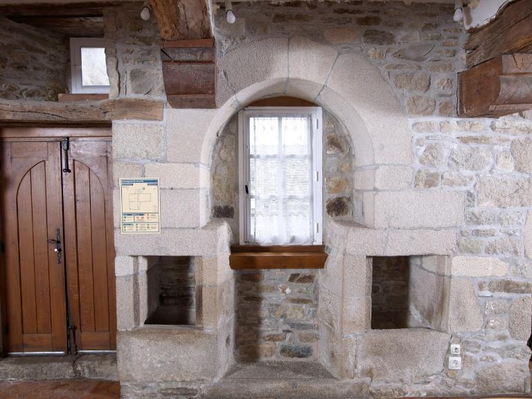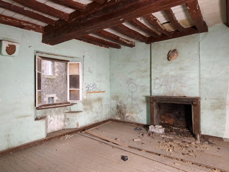 Au nord de ladite chambre autre petite chambre hentée par la précédente séparée par un mur de refend : ladite chambre éclairée par deux fenêtres de taille… ; en la longère au nord une cheminée à jambage, manteau et attre de grosses tailles ; bout au levant dudit appartement une dalle et cuyer, un cabinet d’aisance, lattre en terrasse.
