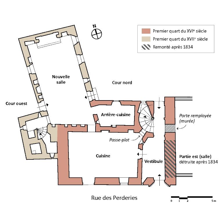 Pour hentisse d’une antichambre une ouverture de porte voutée de taille ; et pour l’éclairer une fenêtre carrée de taille garnie… Au nord de l’antichambre une chambre et cabinet clos et séparés par des cloisons en menuiserie, éclairés par deux fenêtres carrées de taille, le cabinet aussi éclairé par une moyenne fenêtre garnie d’un châssis en menuiserie et vitrage en plomb. Au pignon au nord de ladite chambre une cheminée à jambages, manteau et corniches de taille ; lattre carrelée en tuile.