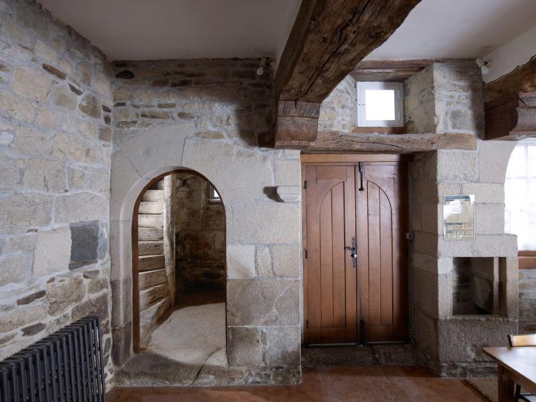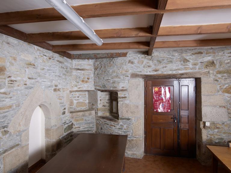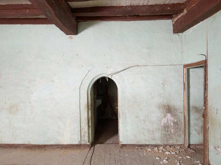 Un corridor au nord de cette dernière chambre hentée par une porte voutée de taille donnante sur l’escalier ; ledit corridor communiquant et servant à fréquenter la précédente chambre, et autre chambre au couchant des précédentes ; cette dernière éclairée par une fenêtre de taille garnie […], en ladite chambre une cheminée de taille à tablette.