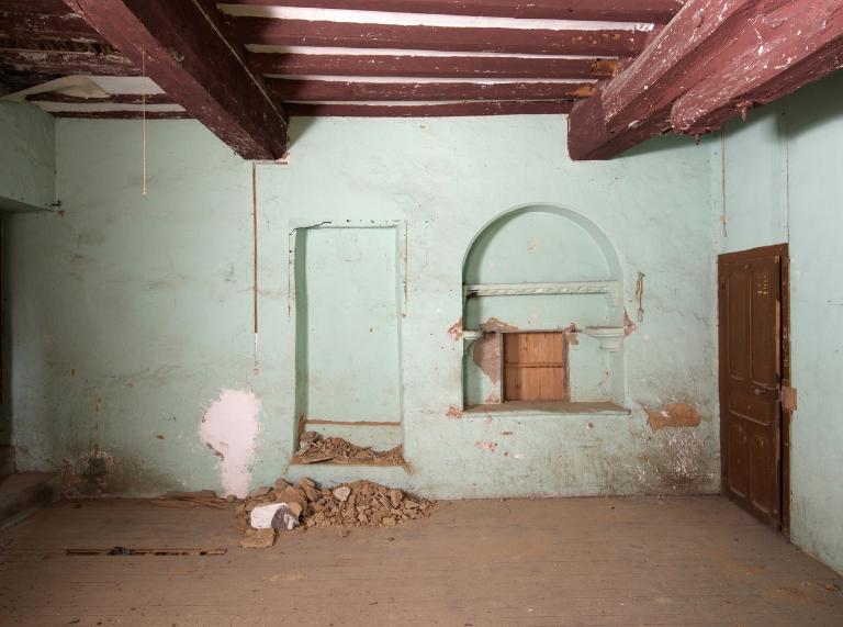Bout au couchant et au nord du précédent édifice un vestibule communiquant à la grande cuisine par une baie de porte en maçonnerie ; deux autres portes voutées de taille donnantes aussi sur ledit vestibule, l’autre servante à fréquenter la cour au levant, et l’autre celle au couchant ; au nord dudit vestibule et seulement séparé par une cloison en menuiserie une salle et cabinet éclairés par trois fenêtres carrés de taille garnies de châssis… ; lesdits cabinets clos et séparés de ladite salle par des cloisons en planches ; en ladite salle une cheminée à tablette boisée sur toute la hauteur et à chaque angle une armoire d’attache et le surplus de la hauteur boisée en menuiserie ; les cottières levant et couchant boisées à hauteur d’appui ; lattre de ladite chambre et cabinet planchis en sapin.