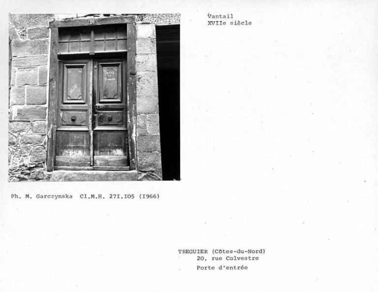 La maison sise au numéro 20 de la rue Colvestre a vraisemblablement été construite dans la seconde moitié du 16e siècle comme le montre l’analyse stylistique de son pan de bois. Côté jardin, un linteau de fenêtre porte le millésime 1729. Une boutique a été aménagé au rez-de-chaussée. La porte actuelle semble datable du 17e siècle.