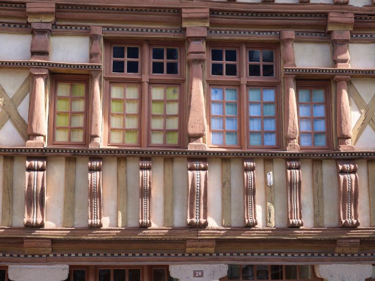 Cette riche maison à étage carré et comble à surcroit présente une façade à pan de bois sur piliers de pierre. L'étage à pan de bois est en encorbellement sur poutres. Les fenêtres sont regroupées au centre de la façade : deux croisées assorties de demi-croisées. Le décor est porté sur les potelets sculptés en forme de colonnettes renflées et de balustres ainsi que sur les entretoises, sablières et bandeaux d'appuis des fenêtres, soulignés par des denticules. Au rez-de-chaussée, trois piliers et deux demi piliers en pierre supportent l'encorbellement d'étage. Ils reposent sur un mur bahut constituant l'étal de la boutique. Le rez-de-chaussée largement ouvert sur la rue plaide, en effet, pour un usage commercial.