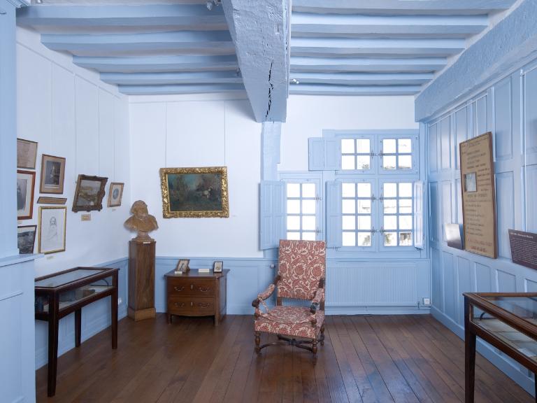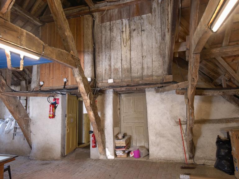La porte d'entrée très large et modulable, avec ses deux parties dormantes et son vantail, semble adaptée au besoin de la maison, celui de faire rentrer des encombrants dans la boutique située à gauche. A droite, une pièce étroite est réservée à l'armateur pour l'accueil de ses clients, directement accessible par l'extérieur. Derrière la boutique, la cuisine possède un accès à la cave sous la première volée de l'escalier. Quatre pièces à feu se partagent l'étage : deux petites chambres sur jardin et deux grandes salles sur rue séparées par une cloison en bois d'origine. L'une d'elle reçoit un éclairage supplémentaire à l'est par une fenêtre en pignon (comme au rez-de-chaussée). Une partie du grenier a probablement servi de chambre de domestique comme en témoignent le sol couvert de tommettes et l'éclairage apporté par la fenêtre du pignon.