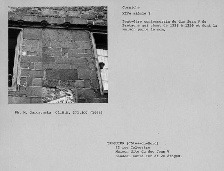 Cette appellation de maison du duc Jean V qui est vraisemblablement postérieure à l'Ancien régime n'est peut-être pas plus fondée que celle de maison des ducs de Bretagne à Saint-Brieuc, datée de 1572, c'est à dire quarante ans après la disparition du duché. Mais pour plus de commodité, il convient de lui laisser l'identité dont elle jouit à Tréguier. Cette maison de toute façon ne pouvait appartenir qu'à une famille de grande envergure. On trouve sus l'ancien régime plusieurs maisons qui ont ainsi un surnom, mais presque toujours à connotation religieuse : la maison des Sept saints à proximité du quai, Rome à côté du couvent des Soeurs de la Croix, le Vatican sur la place, ou encore Notre-Dame de la Pitié rue des Perdreries.
