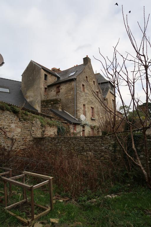 Maison construite sur une parcelle étroite et profonde s'évasant légèrement vers l'arrière. Elle présente une façade sur rue en moellons sur piliers en pierre de taille de granite. La façade sud sur cour est montée en petits moellons de schiste, percée de nombreuses baies aux encadrements chanfreinés : petites fenêtres au comble et au 2e étage, demi-croisée et croisées au 1er étage et au rez-de-chaussée, surmontées d'un arc de décharge. Le plan à deux pièces par niveau et escalier à vis latéral en demi-hors-oeuvre, accolé au mur gouttereau ouest en position centrale, est caractéristique de la fin du Moyen Age. Au rez-de-chaussée, la boutique donne sur la rue et la salle-cuisine donne sur la cour. La porte latérale ouvre sur un couloir qui permet d'accéder à la cage d'escalier et aux étages en longeant la boutique.