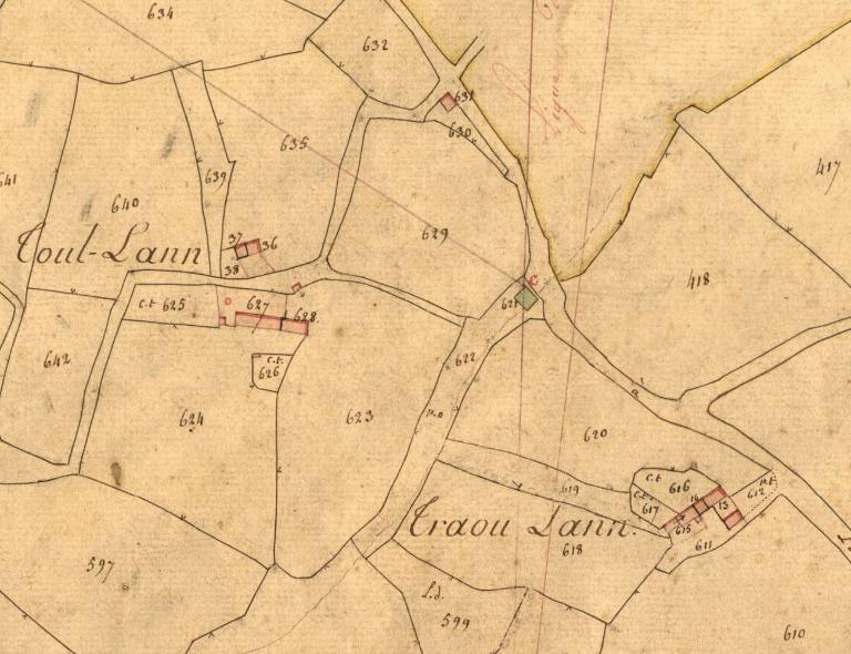L'ancienne ferme de Traou Lann n'a conservé que son logis et une petite dépendance construite en alignement. Sur le cadastre ancien, trois autres bâtiments sont figurés : deux en alignement du logis et de la dépendance, à l'ouest : un en face du logis, au sud. Sa situation, à environ 800 mètres de Kericuff, son ancienneté et sa taille laisse à penser que Traou Lann était peut-être une métairie noble du manoir voisin. Le logis est édifié entre la fin du 15e siècle et le tout début du 16e siècle comme en témoignent les portes nord et sud en tiers point et les fenêtres à chanfrein et accolade. La fenêtre du rez-de-chaussée, à droite de la porte, a été percée vers le milieu du 20e siècle.
