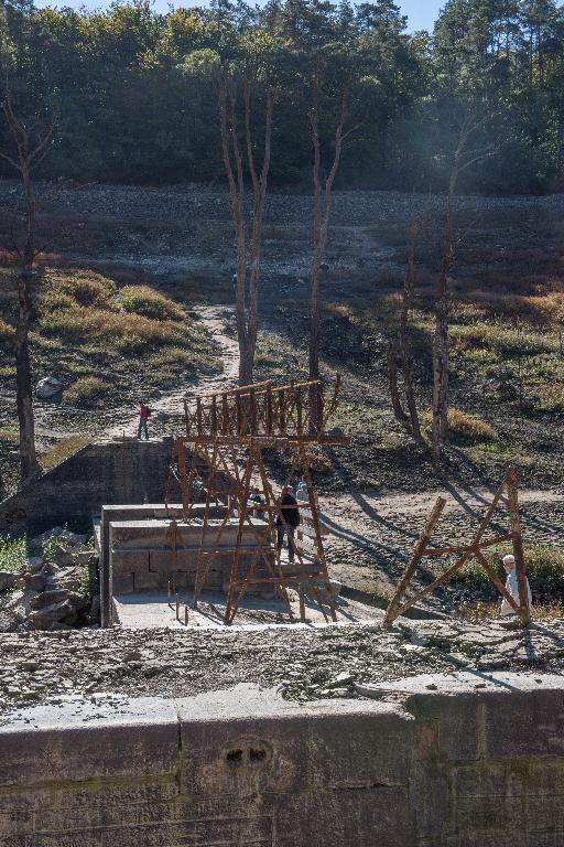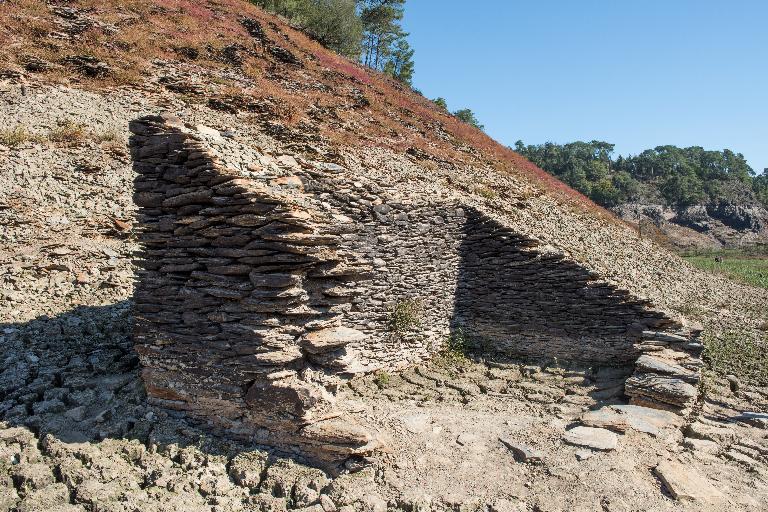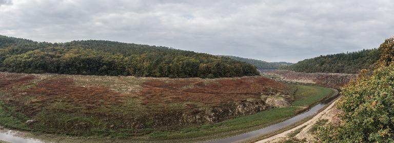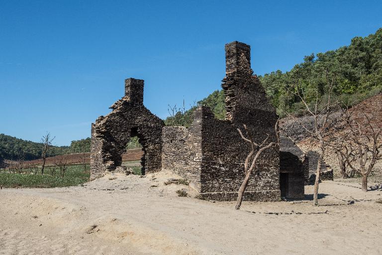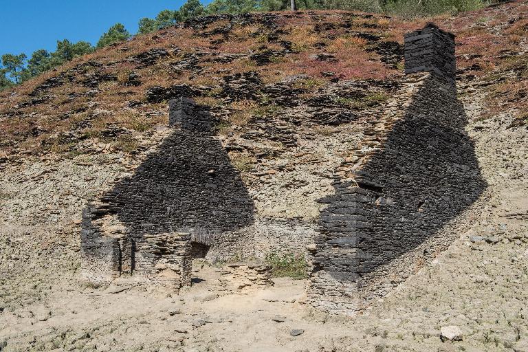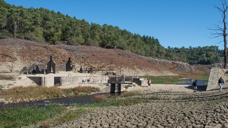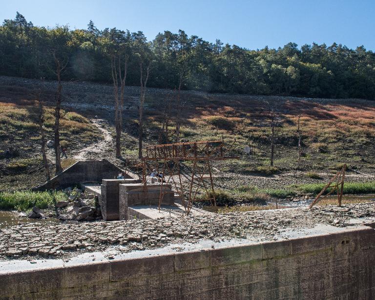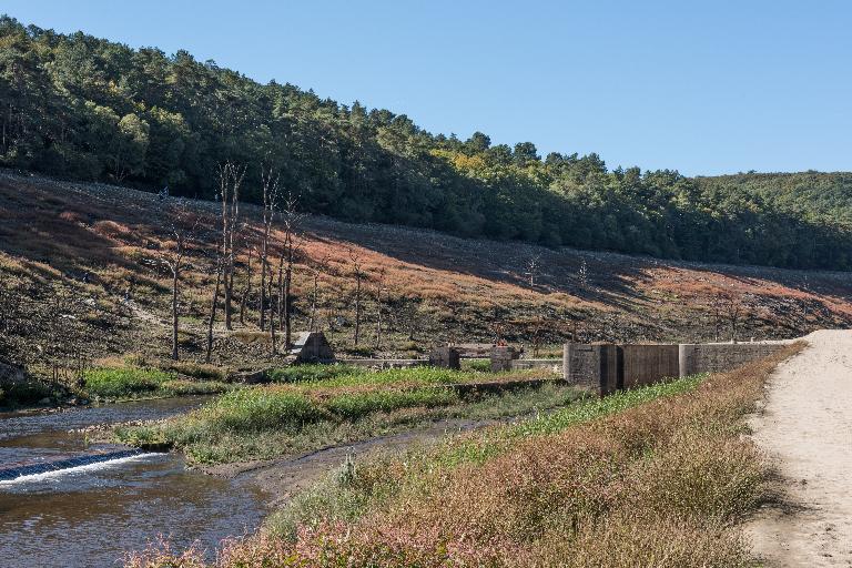Site d'écluse et anciennes fermes noyés lors de la mise en eau du barrage de Guerlédan.