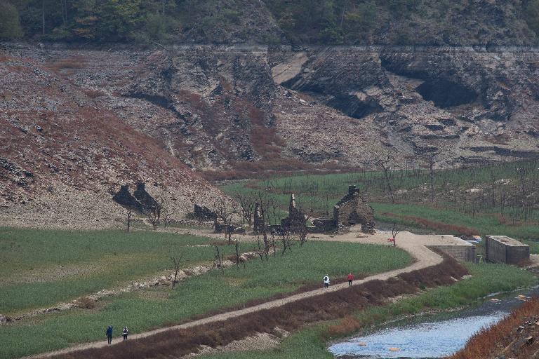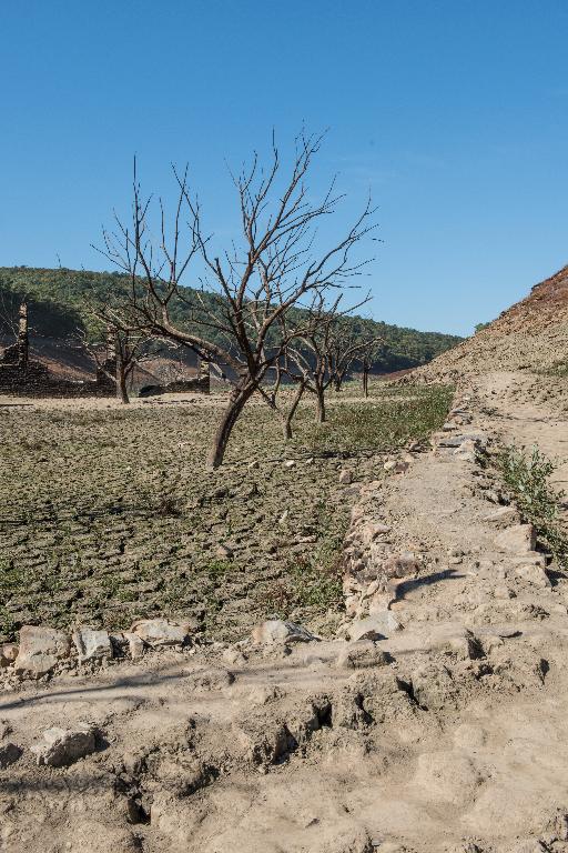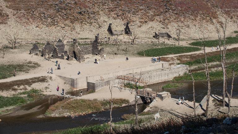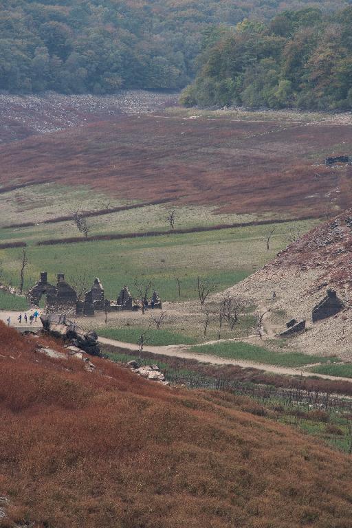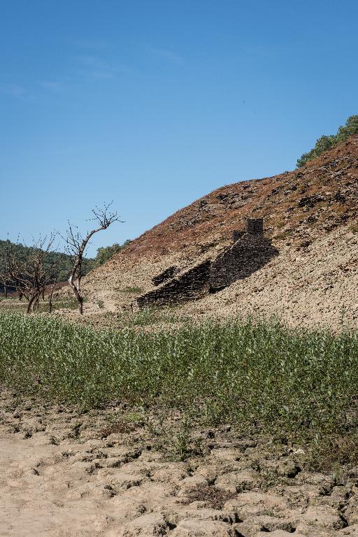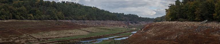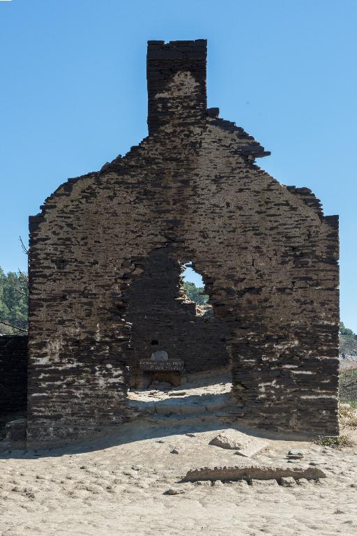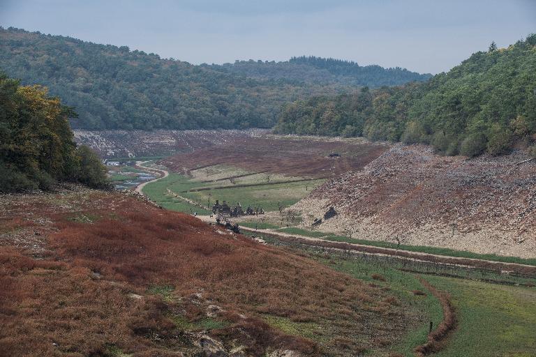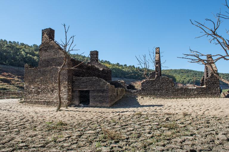 Site d'écluse et anciennes fermes noyés lors de la mise en eau du barrage de Guerlédan.