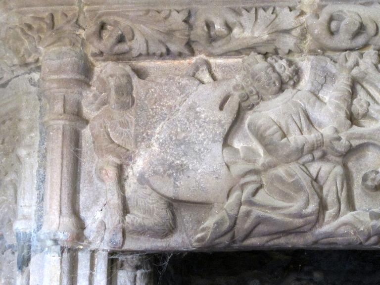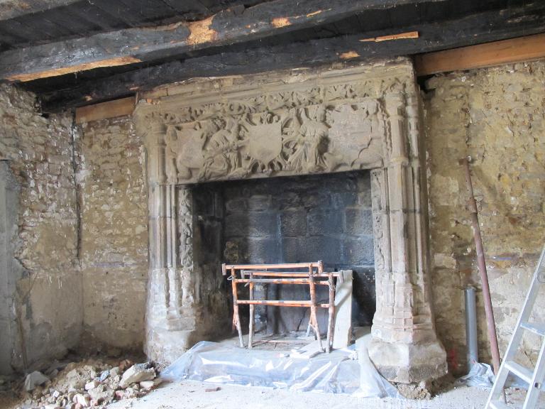 Le décor du trumeau de la cheminée est orné de trois blasons martelés de formes différentes dont des cuirs soutenus par des tenants : un sauvage, à gauche, deux anges au centre, et une sirène à droite. La forme des écus et le style de la sculpture indiqueraient une datation proche du début du 16e siècle. Les armoiries sont difficilement identifiables, celles de gauche un mi parti écartelé avec une croix, celles du centre trois têtes d'animaux, celle de droite un écartelé sans pouvoir le décrire davantage.