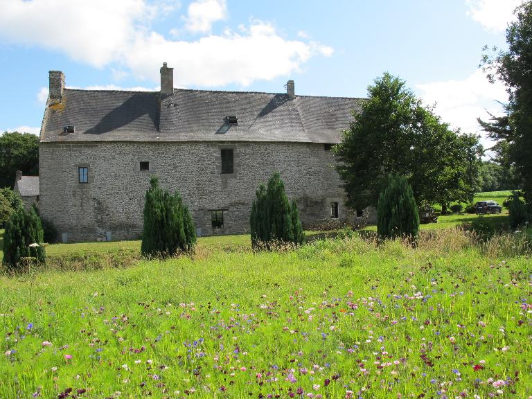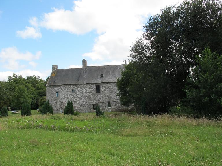 Cour autrefois fermée par un portail dont subsiste la porte piétonnière surmontée d'armoiries buchées. Le logis seigneurial est situé à l'est de la cour et les communs à l'ouest. Des bâtiments annexes se sont greffés au nord et au sud. Le logis est entièrement construit en pierre de taille de granite. Les lits des pierres permettent de faire une lecture des maçonneries et de ses bouleversements. Quelques collages apparaissent. La corniche est supplée par un lit régulier de pierre de taille de granite. Celle-ci est interrompue deux fois, indiquant l'emplacement de lucarnes disparues.
