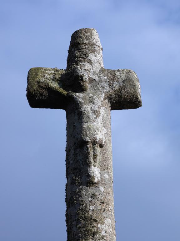 Croix monolithe en granite, à fût cylindrique, bras courts et cime fuselée sur socle carré. Le Christ en croix porte un long périzonium caractéristique du Moyen Age.