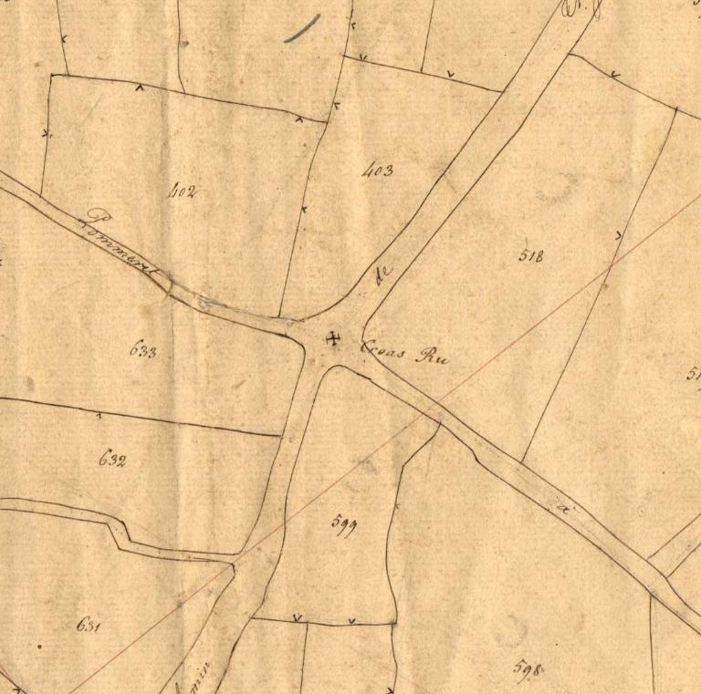 Près de Prat Lédan, cette croix du 16e siècle est érigée à un carrefour, sur l'ancienne voie gallo-romaine allant de Guingamp à La Roche-Derrien. Sur le cadastre ancien, elle est appelée Croaz ru, toponyme que l'on retrouve au sud du bourg et qui signifie le croisement rouge, souvenir de l'époque gallo-romaine où un édifice en brique rouge était peut-être construit à cet emplacement. Le socle porte la date de sa restauration en 1828. La base est moderne.