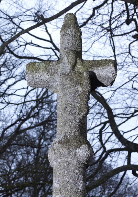 Croix de chemin réalisée à la fin du 14e ou au début du 15e siècle, placée devant la chapelle seigneuriale Sainte-Anne, figurée sur le cadastre ancien. Il est possible que cette croix ait été déplacée au 17e siècle et remontée devant la chapelle comme en témoignent le socle et la base plus tardifs que la croix elle-même.