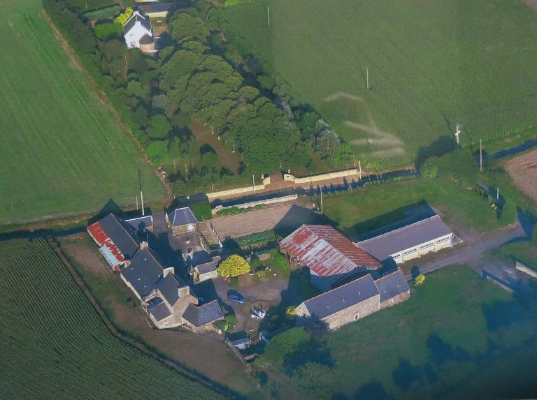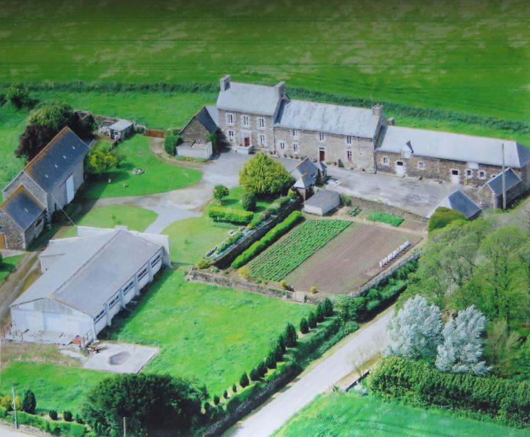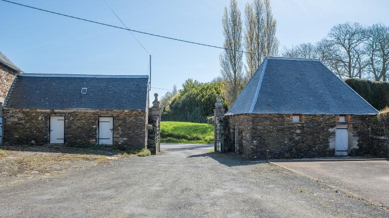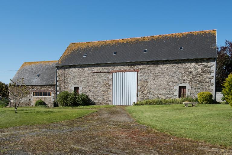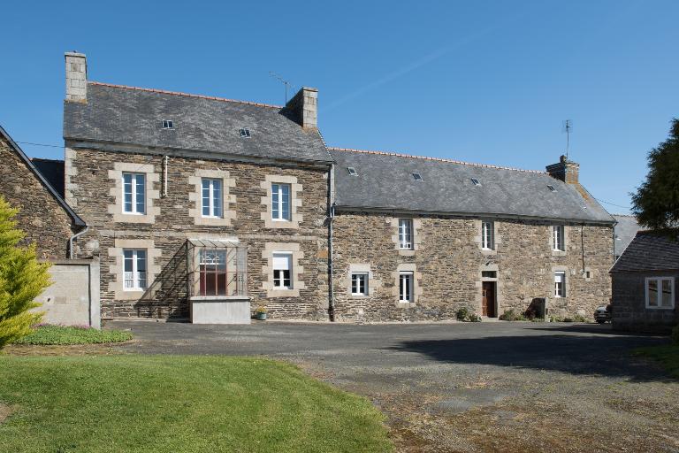 Grande ferme composée de deux logis et de deux étables formant alignement avec deux soues construites en retour d'équerre en bout, à l'est et à l'ouest. Un muret partiellement détruit sépare la cour de l'aire à battre dans laquelle se trouve une immense grange à porte charretière sur gouttereau. Un puits en guérite est encastré dans le muret de séparation : de plan carré, avec des montants appareillés en pierre de taille de granite, couvert d'un toit en pavillon en ardoise. Le mur de margelle réemploie un élément ancien orné de motifs de style Renaissance : médaillon ovale encadré de "cuirs découpés" sculptés en haut relief. L'entrée de la cour est marquée par deux piliers moulurés sommés d'une boule. Au sud de la cour, le grand jardin potager est enclos de murs.