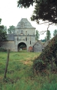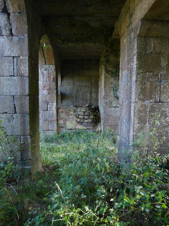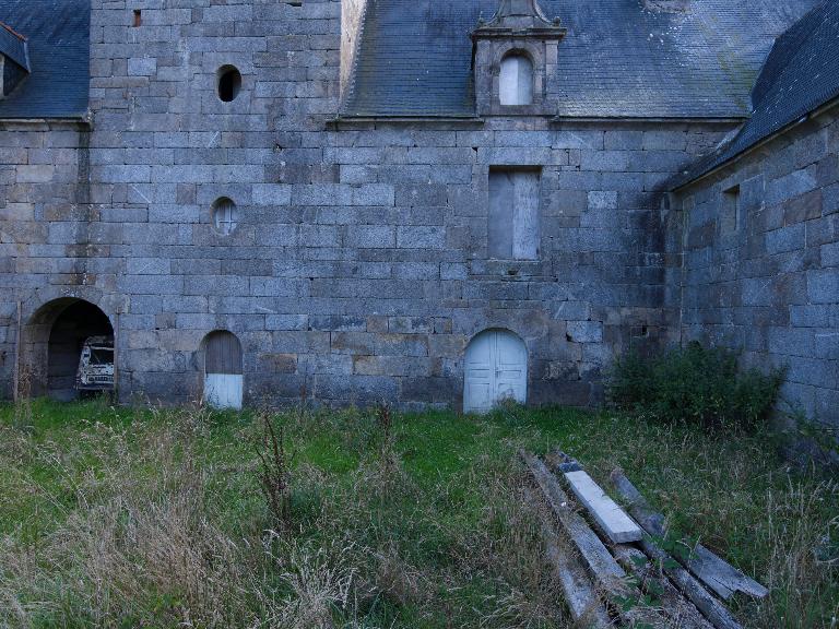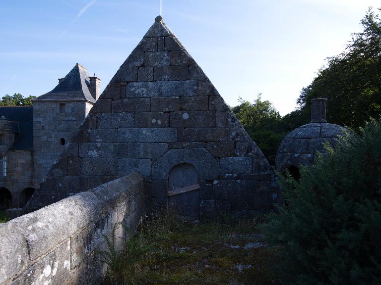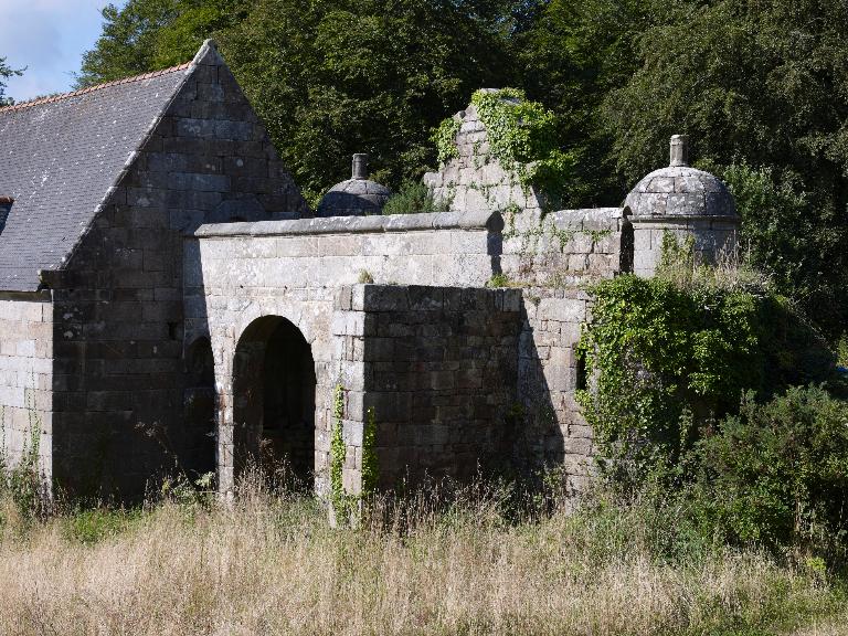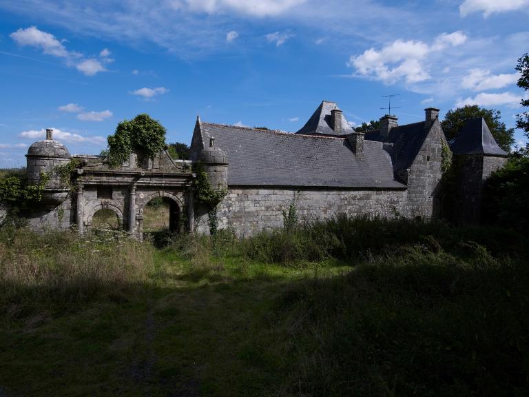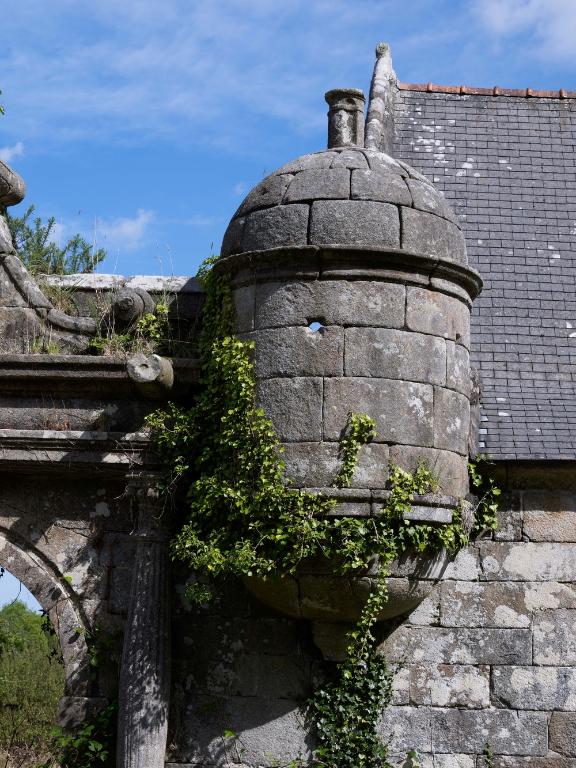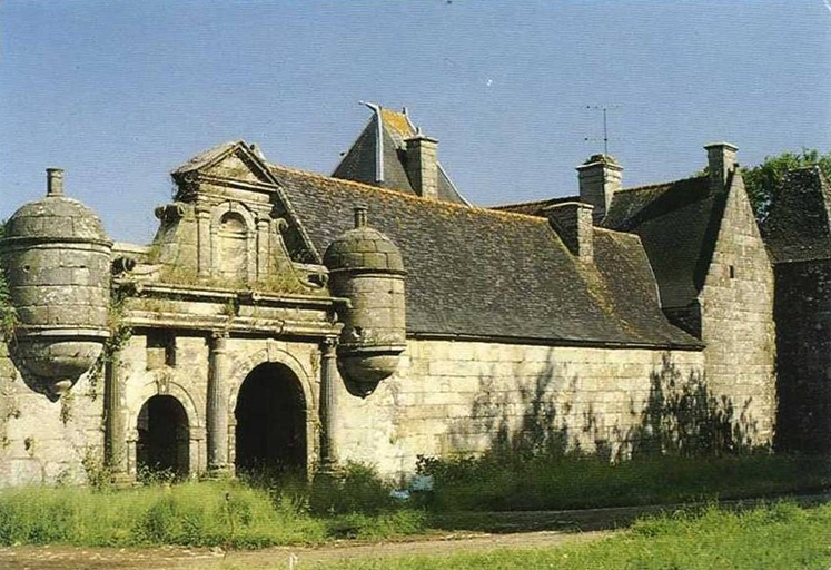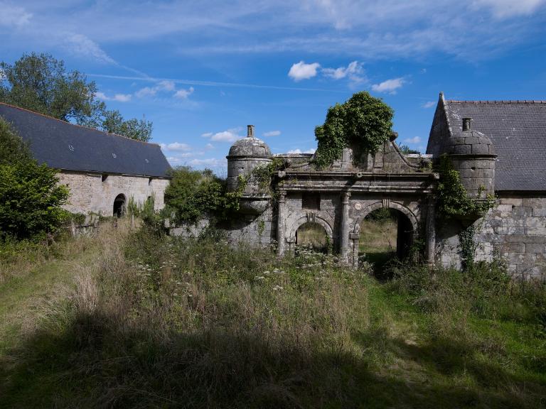 Portail monumental en pierre de taille de granite comprenant une porte charretière et une porte piétonne encadrées de deux guérites ou échauguettes. Chacune des deux guérites est dotées de trois ouvertures de tir. Le plan de feu élaboré permet une défense rapprochée à l´aide d´armes à feu portatives. Décor de style Renaissance.