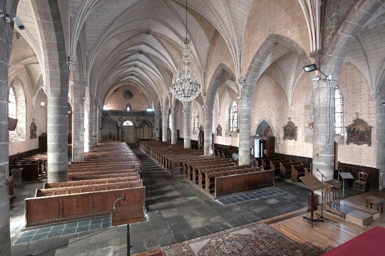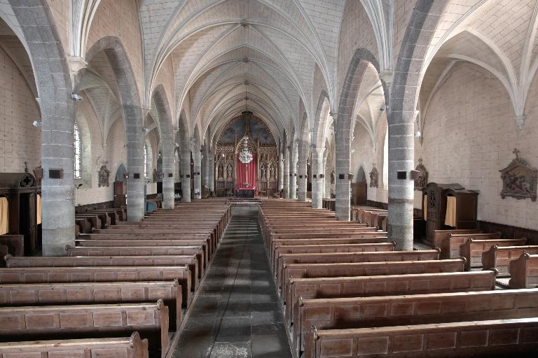 A l’intérieur de l'édifice, la nef et les bas cotés sont enduits avec motif de parement. Les piliers de la nef sont agrémentés de croix de malte à l'occasion de la mission de 1895. L'enduit peint du transept et du chœur présente des motifs néogothiques. Le transept sud destiné à accueillir l'autel du Sacré-Coeur, est dallé d'ardoises en 1966 afin de recevoir les fonds baptismaux. Dans le but de rendre hommage au recteur Piedvache ses restes sont exhumés en 1851 afin de les placer au plus près de l'église qu'il a fait construire, la stèle de marbre blanc est scellée au sol de cette chapelle.