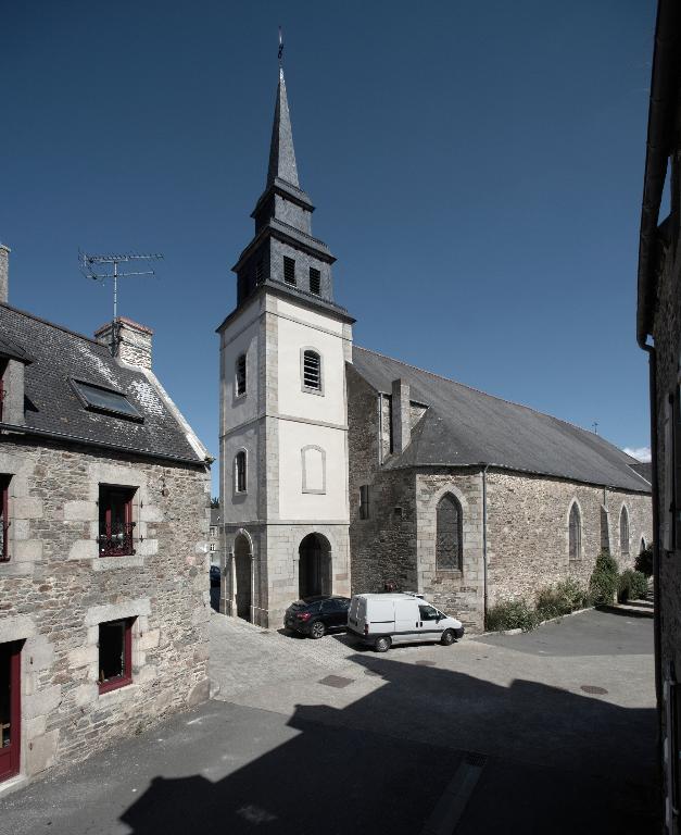 La tour-clocher, premier élément reconstruit au 19e siècle, est aujourd'hui la seule partie conservant un enduit extérieur. Le premier niveau en pierre de taille est traversant. Au sol une dalle funéraire d'un noble homme de Corseul y est scellée au centre du pavage selon ses dernières volontés afin de racheter ses péchés. Les deuxième et troisième niveaux sont enduits, le chainage d'angle est en pierres de taille ainsi que les bandeaux qui rythment les changements de niveaux. La flèche est couverte en ardoise.