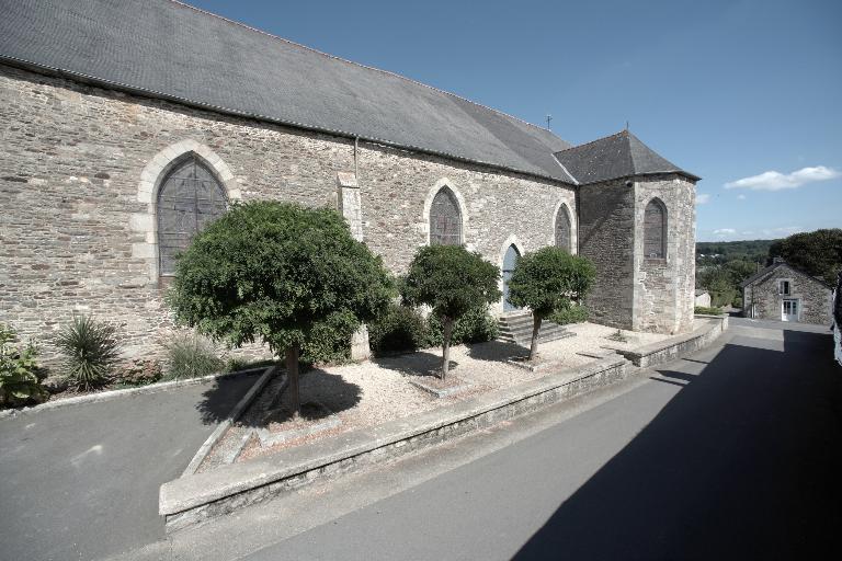 L'église paroissiale Saint-Pierre est construite en granite et schiste selon un plan en croix latine avec nef et bas-cotés, transept saillant et chevet plat auquel est accolé la sacristie. De style néo-gothique elle était destinée à être enduite. L'accès à l'édifice s'effectue au nord par le portail de l'ancienne église. Deux des trois colonnettes surmontées de chapiteaux sculptés de feuilles reçoivent les voussures moulurées de l'arc en tiers-point. La sculpture d'une tête de femme datant du 15e siècle surmonte la pierre portant l'inscription "Église bâtie par la foi des habitants de Corseul / An 1834 1836 / Gloire à Dieu". Le mur ouest de l'église s'appuie sur la tour-clocher.