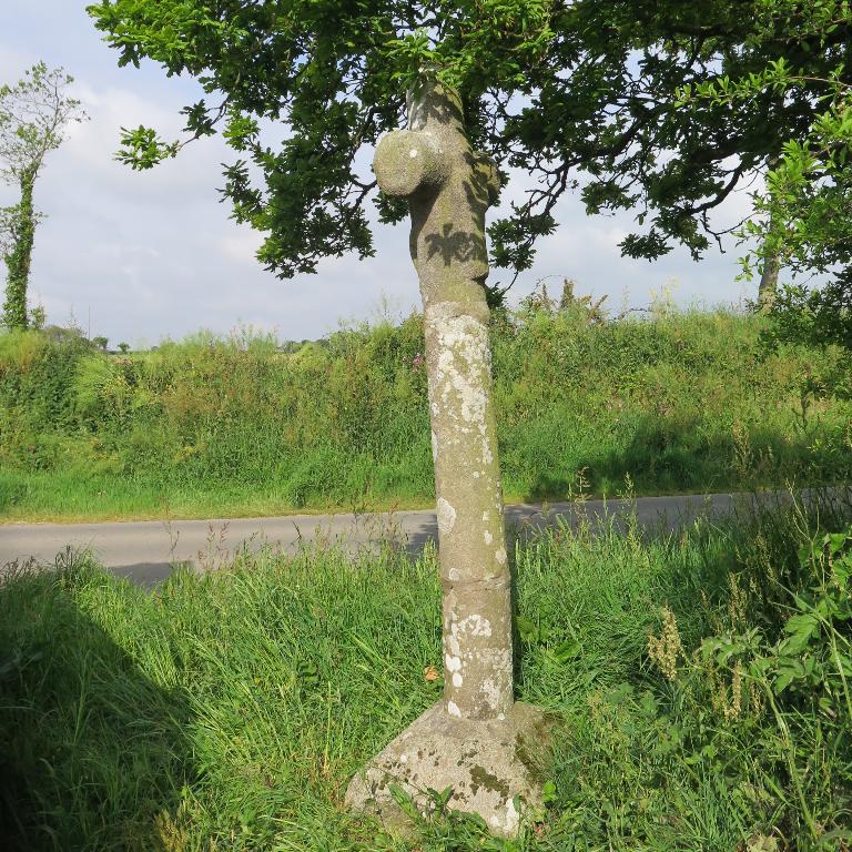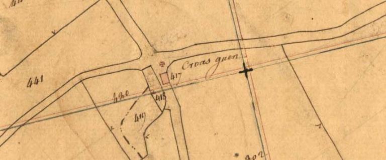 La croix de chemin de Kroas Gwen est implantée en bord de route, au carrefour d'une ancienne route transformée en chemin piétonnier. Elle est figurée sur le cadastre ancien de 1834.