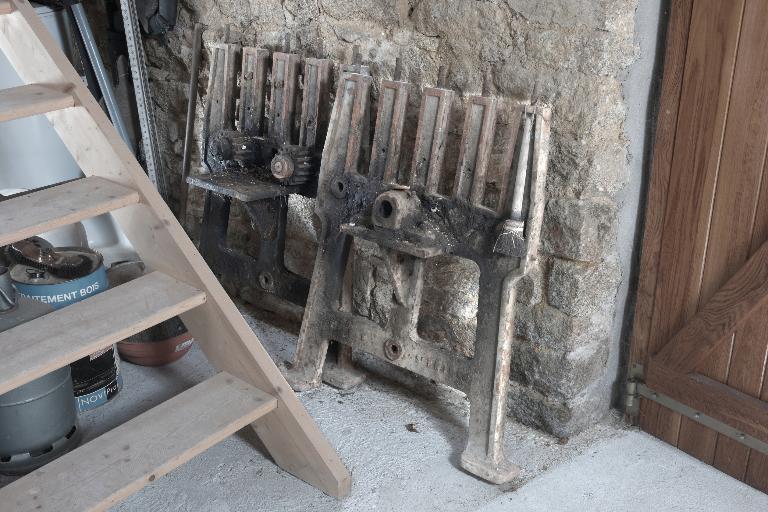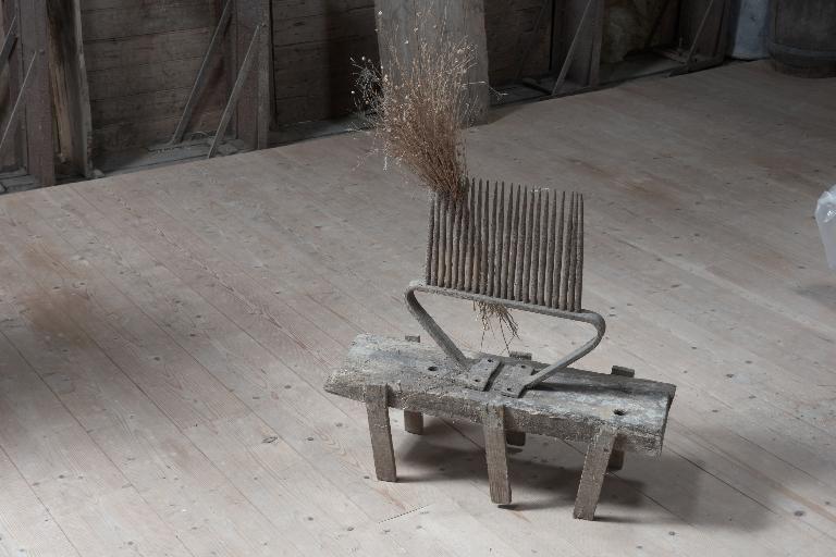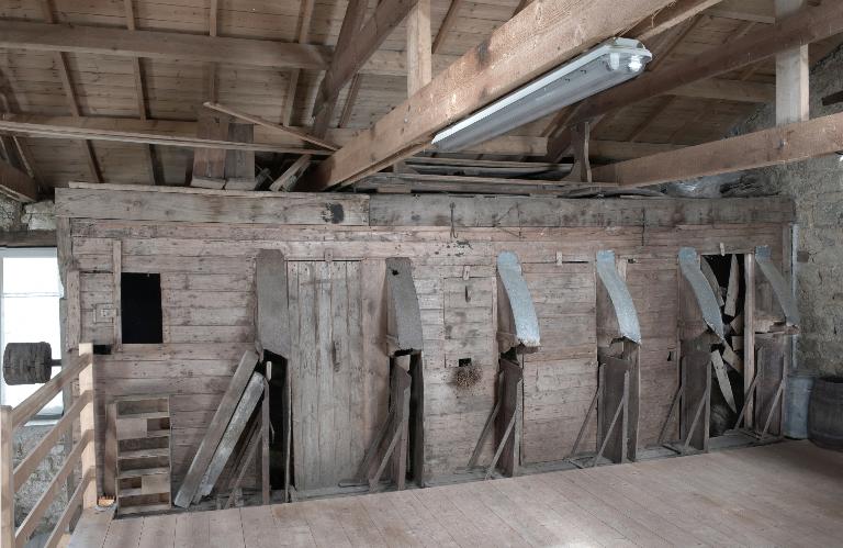 Un atelier de teillage est équipé d'un broyeur, d'un peigne, de spatules, d'une "secoueuse" d'étoupe... Du broyeur ne subsistent ici que les rouleaux de fonte rainurés qui brisent les tiges de lin au tout début du processus. Les poignées de tiges ainsi assouplies sont ensuite présentées aux spatules en buis de la teilleuse (toujours en place) qui les battent à raison d'environ 300 coups par minutes pour les débarrasser des résidus de lignine (chènevotte) et les assouplir. Des coffrages de bois autour des spatules et de leur axe de rotation, limitent la dispersion des petits déchets. Preuve de la modernité de l'atelier, un système d'aspiration des poussières est également couplé à ces coffrages.