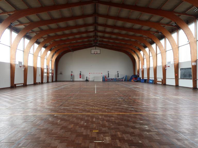 Salle prévue pour couvrir une aire de jeux de 42 m x 20 m, flanquée de vestiaires à l'est et d'un foyer sportif au nord. Petite structure d'escalade dans la mezzanine.
