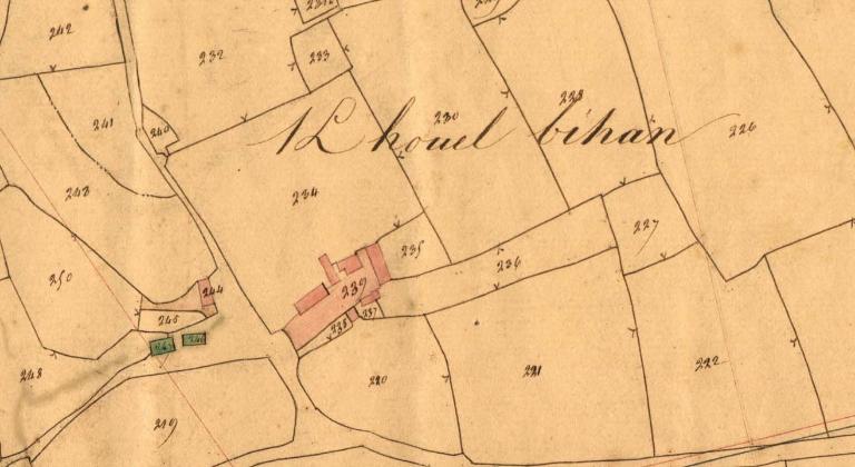 Le cadastre permet aussi de mesurer l'évolution du bâti : si la cour (parcelle 239) et le logis (parcelle 235) figurent bien à leur emplacement actuel, toutes les dépendances autour de la cour ont été reconstruites ailleurs. Cependant, le logis est reconstruit in situ au milieu du 19e siècle tout en conservant des éléments anciens : le pignon du mur nord, le chaînage d'angle sud-est et la cheminée du pignon sud-ouest.