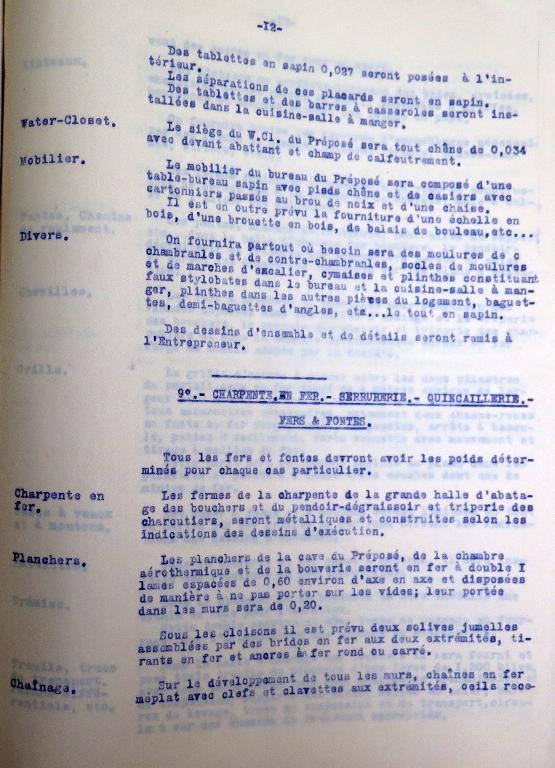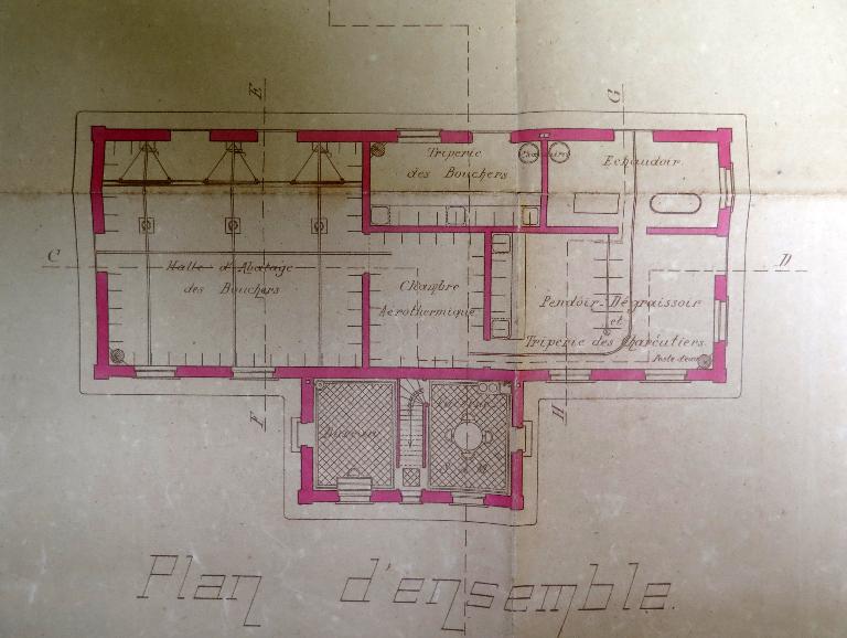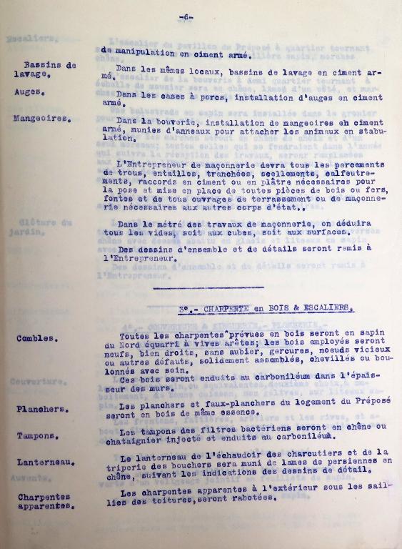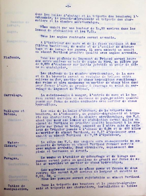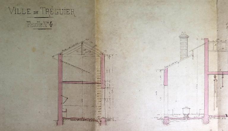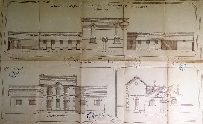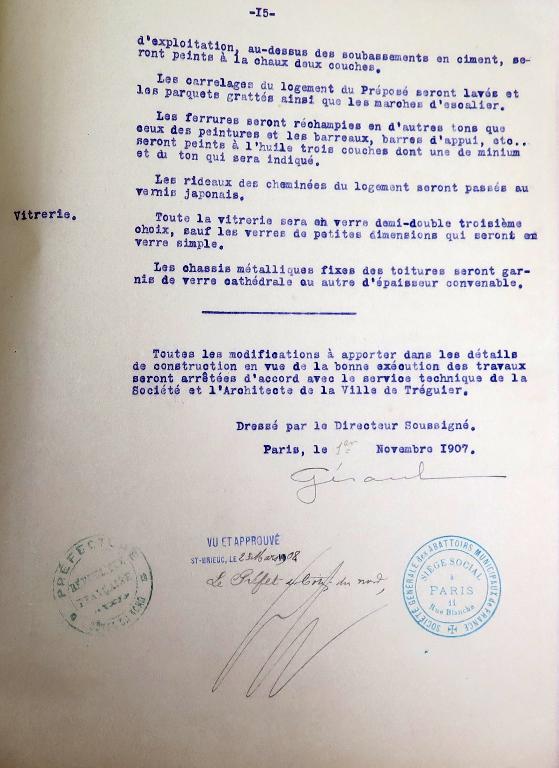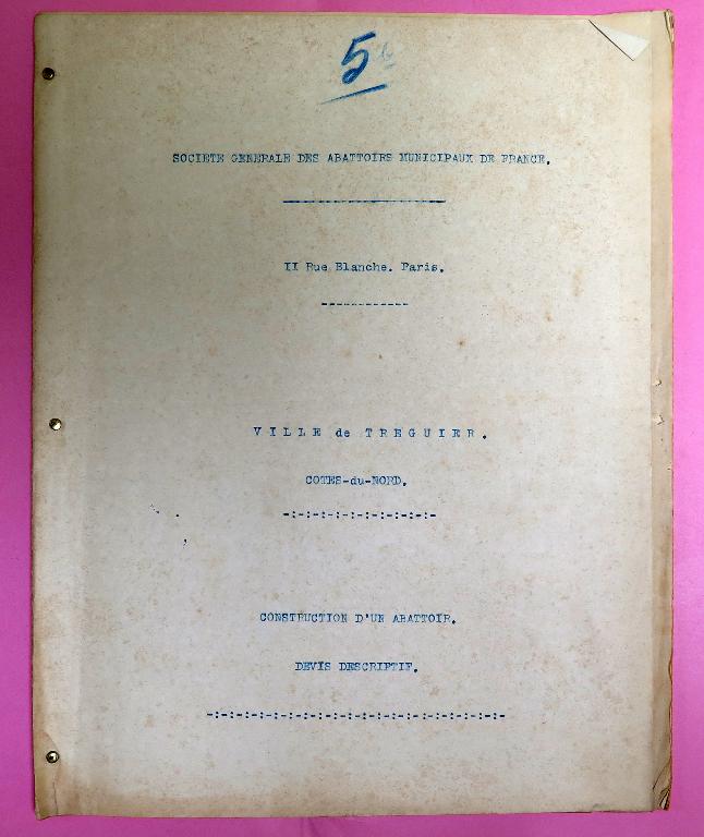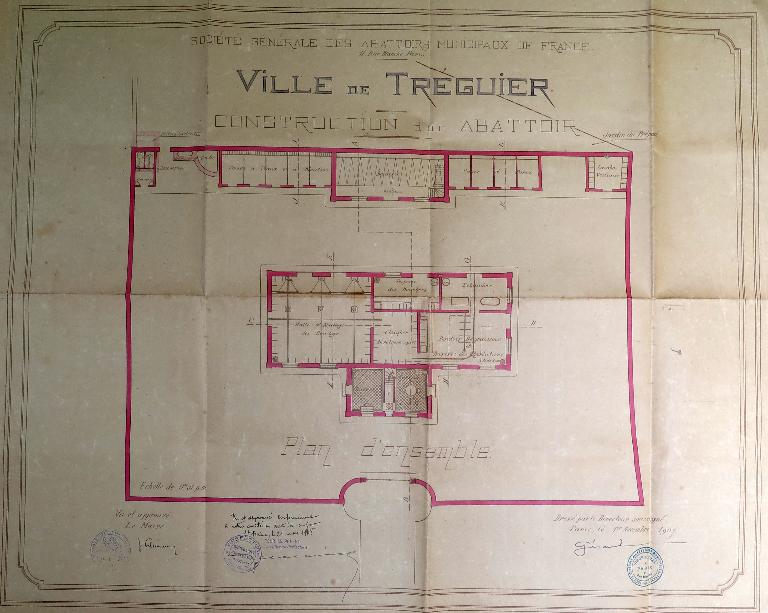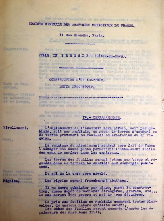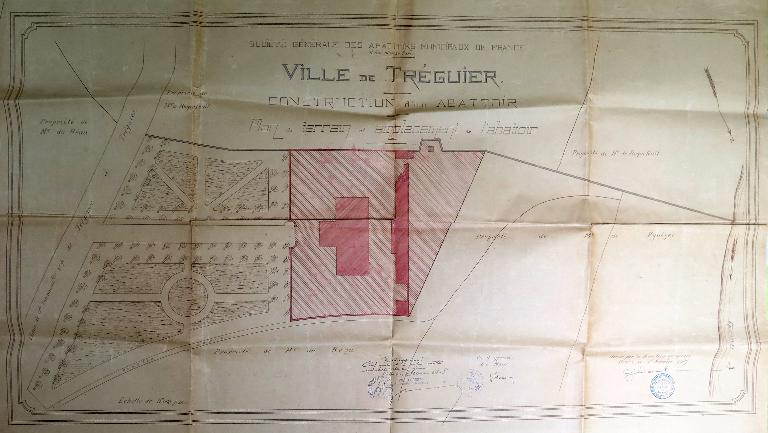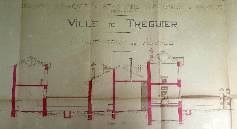 Le "devis descriptif" émanant de la Société générale des abattoirs municipaux de France dressé le 1er novembre 1907 à Paris a été approuvé par le préfet des Côtes-du-nord le 23 mars 1908. Conservé dans le fonds des archives municipales de Tréguier sous la cote 4F15, ce devis comprend 10 articles. Plans d'ensemble et de détails, et "devis descriptif" sont remis à l'entrepreneur (non connu) en charge de réaliser les travaux.