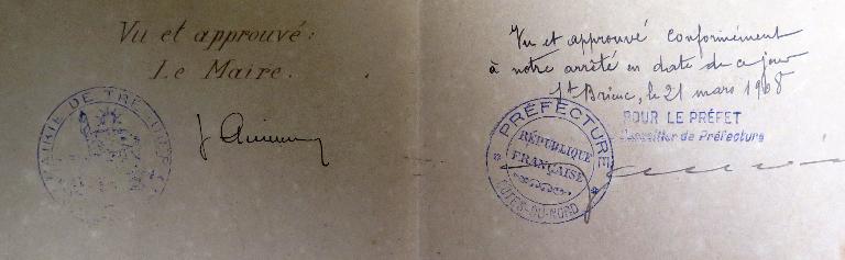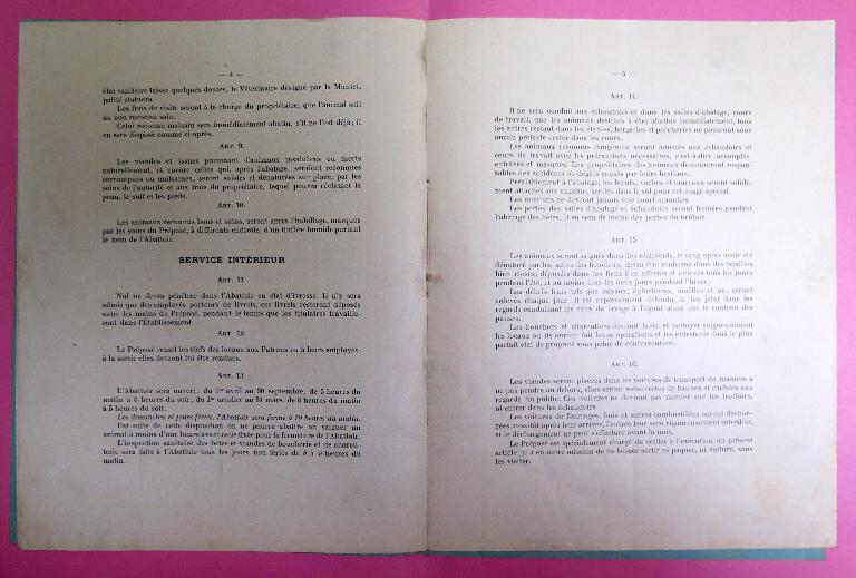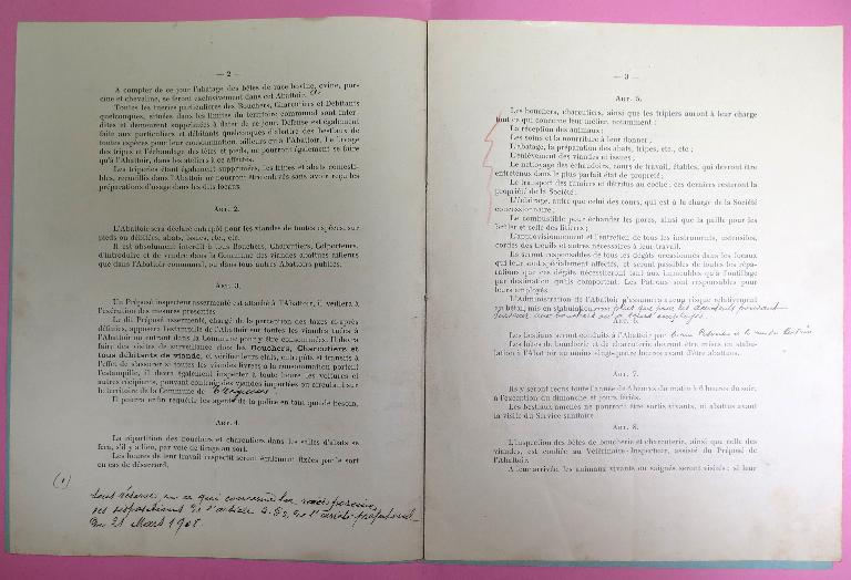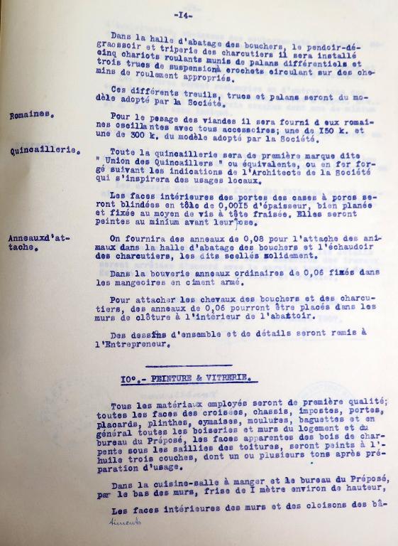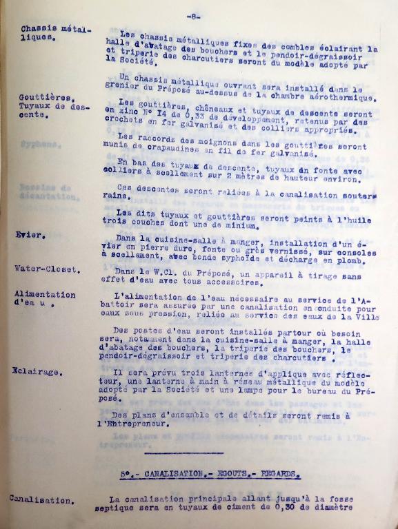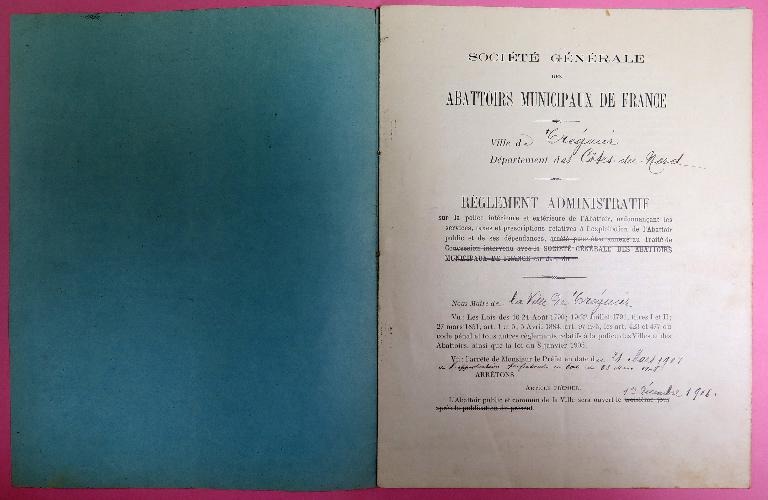 Les archives municipales de Tréguier conservent plusieurs règlements administratifs de l'abattoir public : le plus ancien était annexé au traité de concession avec la Société générale des abattoirs municipaux de France daté des 30 septembre et 3 octobre 1907 ; le second, daté du 9 novembre 1908 et précédent de peu l'ouverture de l'abattoir.