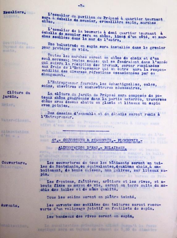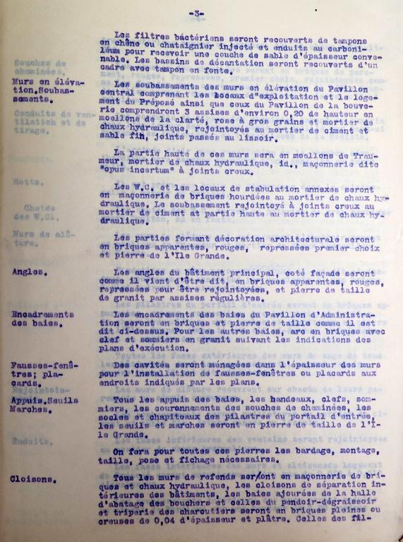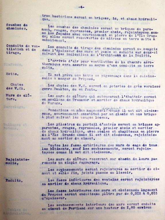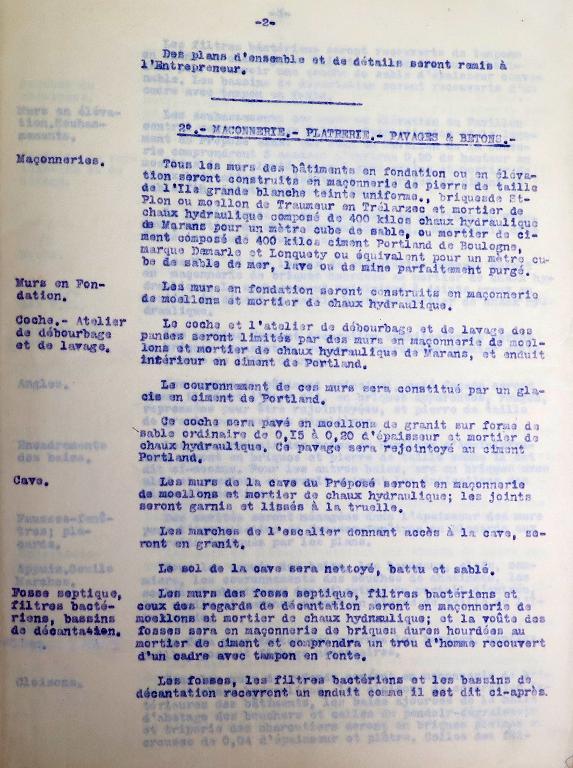 La provenance des maçonnerie est décrite avec soin dans le devis descriptif : "pierre de taille de l'île Grande teinte uniforme [granite]", "brique de Saint-Ilan [Langueux]" ou "moellon de Traumeur en Trélarzec [Traou Meur en Trédarzec]" assemblé avec un "mortier de chaux hydraulique de Marans" ou "mortier de ciment Portland de Boulogne, marque Demarle et Lonquety ou équivalent" et un "sable de mer, lavé ou de mine parfaitement purgé". Soubassements en "moellons de La Clarté [Perros-Guirec], [granite] rose à gros grains".