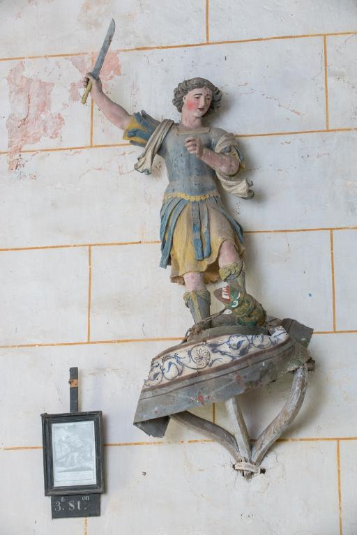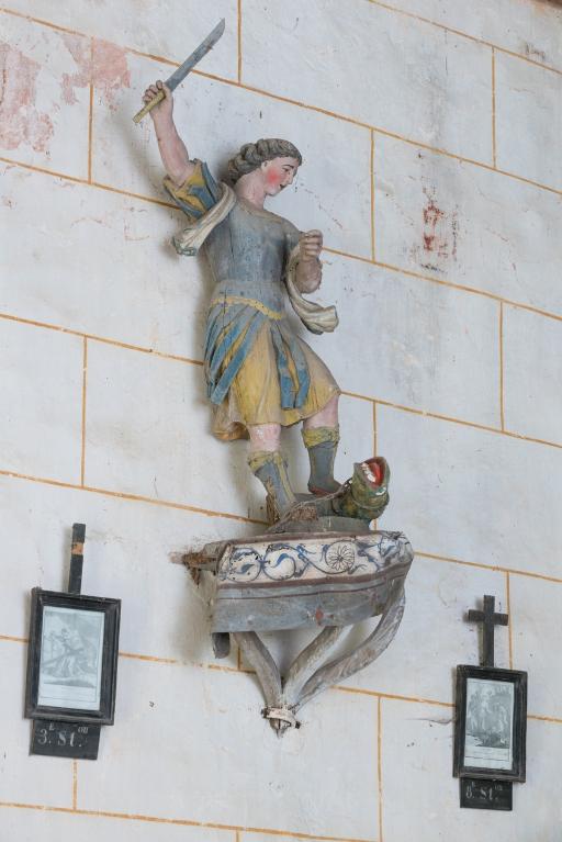Parmi les éléments du mobilier, subsiste l'ancien autel en pierre, qui a été masqué par des panneaux de bois ; les statues de Sainte-Catherine et de Saint-Michel sont des 17e ou 18e siècle, les autres statues sont en plâtre du 19e siècle.