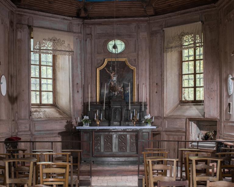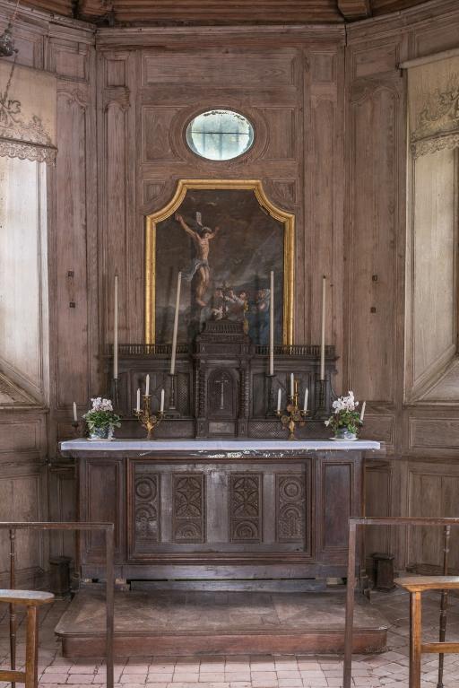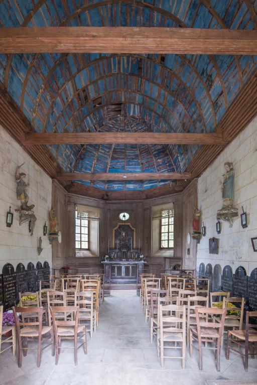 À l'intérieur, le décor de menuiserie avec oculus, laisse entrevoir une partie de la verrière d'axe de forme ogivale qui est obstruée par cet aménagement tardif. L'ensemble est recouvert d'une voûte lambrissée, peinte en bleu ciel.