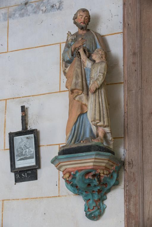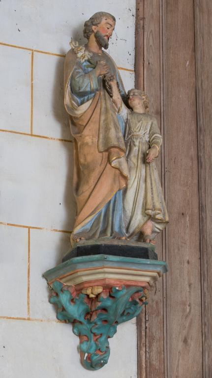 Les accolades entre les modillons sont sculptées. Bénitier en granite sculpté. Porte à arc en anse de panier avec accolade et fleuron.